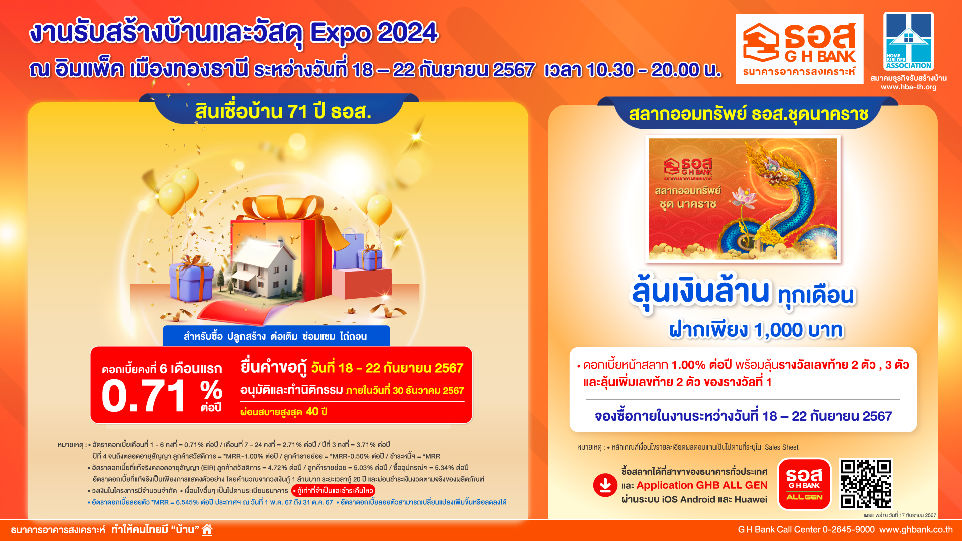 ธอส. จัดโปรโมชันสินเชื่อบ้านอัตราดอกเบี้ยต่ำ 6 เดือนแรกเพียง 0.71% ต่อปี งาน “รับสร้างบ้านและวัสดุ Expo 2024”