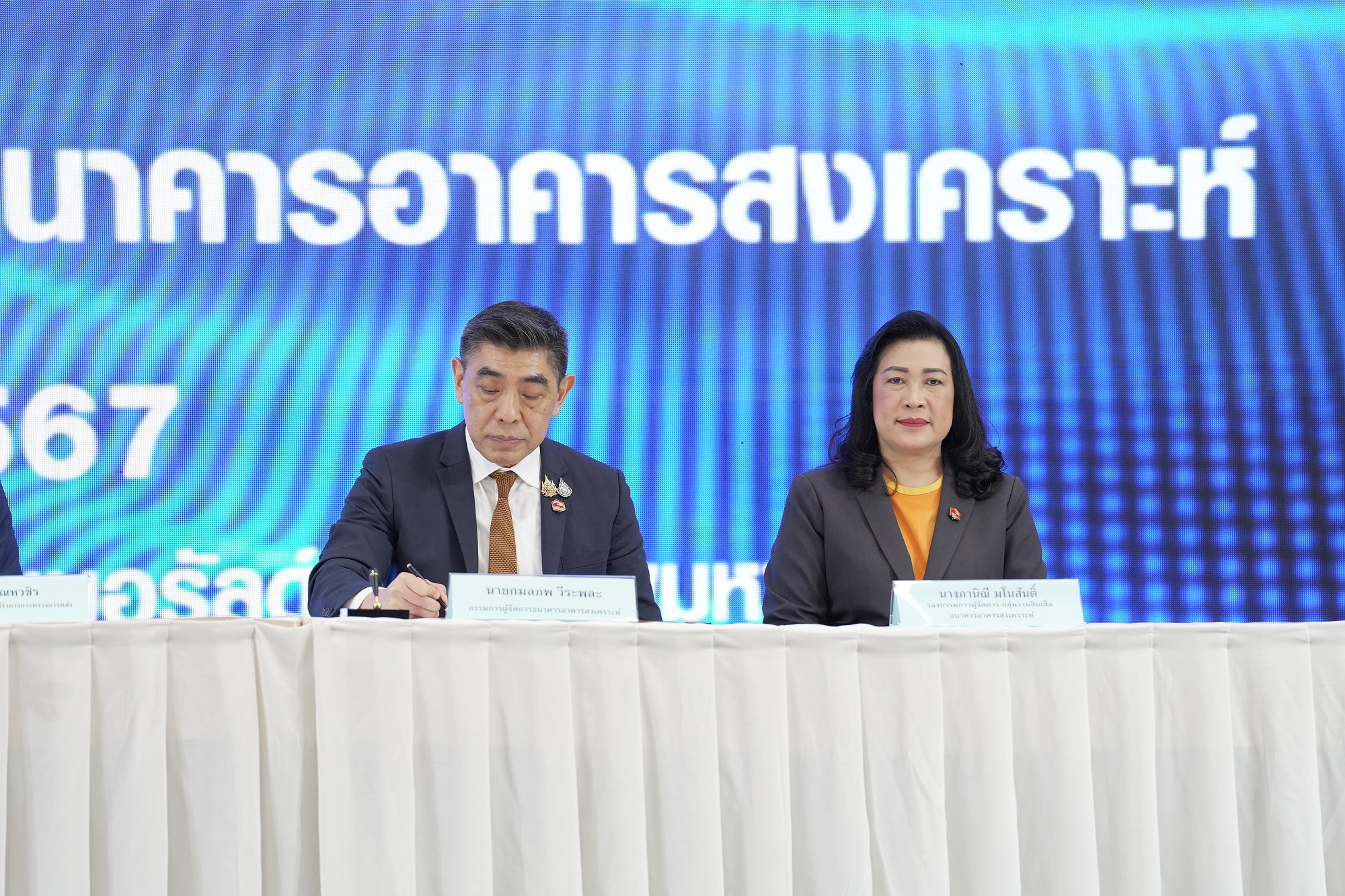 นายกมลภพ วีระพละ กรรมการผู้จัดการ ธนาคารอาคารสงเคราะห์ (ธอส.) เปิดเผยว่า จากความร่วมมือระหว่าง ธอส. และสำนักงานประกันสังคม ในปี 2565 ที่ผ่านมา ผลปรากฏว่ามีผู้ประกันตนตามมาตรา 33 ขอรับรหัสเข้าร่วมโครงการสินเชื่อเพื่อที่อยู่อาศัยอัตราดอกเบี้ยต่ำเป็นจำนวนมาก และทำนิติกรรมเต็มกรอบวงเงิน 30,000 ล้านบาท ในเวลาอันรวดเร็ว ซึ่งสามารถช่วยให้ผู้ประกันตนมากกว่า 25,300 ราย สามารถเข้าถึงสินเชื่ออัตราดอกเบี้ยต่ำ และมีภาระในการผ่อนชำระเงินงวดในแต่ละเดือนลดลง เพื่อนำไปใช้จ่ายในชีวิตประจำวันในส่วนอื่นได้เพิ่มมากขึ้น ดังนั้น ธอส. ในฐานะสถาบันการเงินของรัฐ ที่มีพันธกิจ “ทำให้คนไทยมีบ้าน” โดยตลอดระยะเวลากว่า 71 ปี ได้สนับสนุนให้คนไทยมีที่อยู่อาศัยเป็นของตนเองมาแล้วมากกว่า 4.4 ล้านครอบครัว ครั้งนี้ ธอส. จึงร่วมกับสำนักงานประกันสังคม โดยนายบุญสงค์ ทัพชัยยุทธ์ เลขาธิการสำนักงานประกันสังคม ลงนามบันทึกข้อตกลงความร่วมมือ (MOU) “โครงการสินเชื่อที่อยู่อาศัยเพื่อผู้ประกันตน พ.ศ. 2567” โดยได้รับเกียรติจากนายพิชัย ชุณหวิชร รองนายกรัฐมนตรี และรัฐมนตรีว่าการกระทรวงการคลัง และนายพิพัฒน์ รัชกิจประการ รัฐมนตรีว่าการกระทรวงแรงงาน เป็นประธานในพิธีลงนาม MOU ระหว่าง ธอส. และ สำนักงานประกันสังคม โดยได้จัดกรอบวงเงิน 10,000 ล้านบาท ปล่อยสินเชื่ออัตราดอกเบี้ยต่ำ 5 ปีแรก เพียง 1.59% ต่อปี, ปีที่ 6-8 เท่ากับ MRR – 2.00% ต่อปี และปีที่ 9 จนถึงตลอดอายุสัญญา เท่ากับ MRR-0.50% ต่อปี (อัตราดอกเบี้ย MRR ของ ธอส. ปัจจุบันเท่ากับ 6.545% ต่อปี) ให้กับผู้ประกันตนตามมาตรา 33, 39 หรือ 40 ได้มีที่อยู่อาศัยเป็นของตนเองเพิ่มมากขึ้น โดยสามารถขอสินเชื่อเพื่อซื้อหรือปลูกสร้างที่อยู่อาศัย ภายใต้วงเงินกู้ไม่เกิน 2 ล้านบาท กรณีกู้ 1 ล้านบาท ผ่อนชำระเงินงวดเพียง 3,400 บาท เท่านั้น! สำหรับวงเงินกู้ส่วนที่เกิน 2 ล้านบาท สามารถใช้อัตราดอกเบี้ยผลิตภัณฑ์อื่นของธนาคารได้