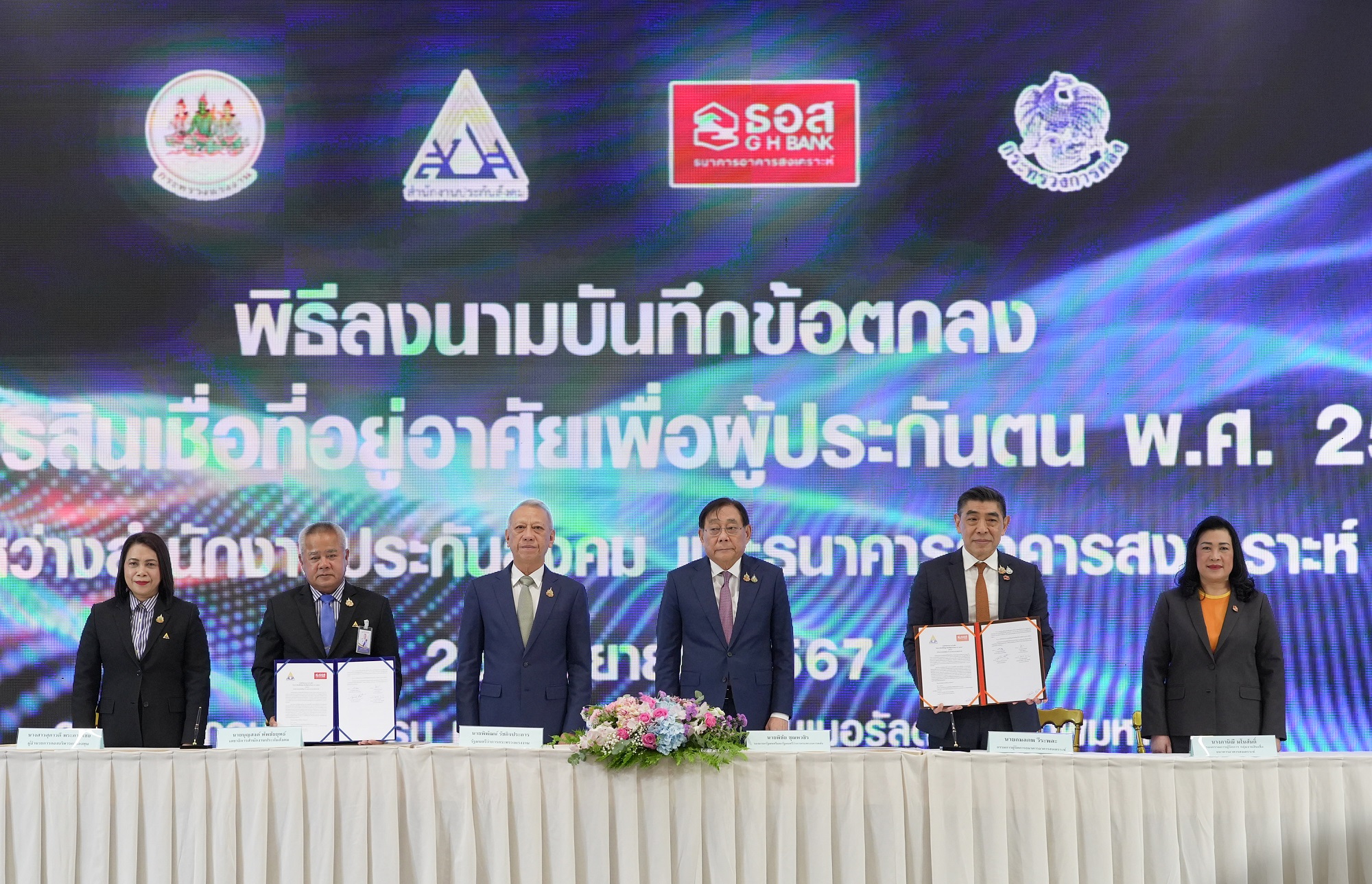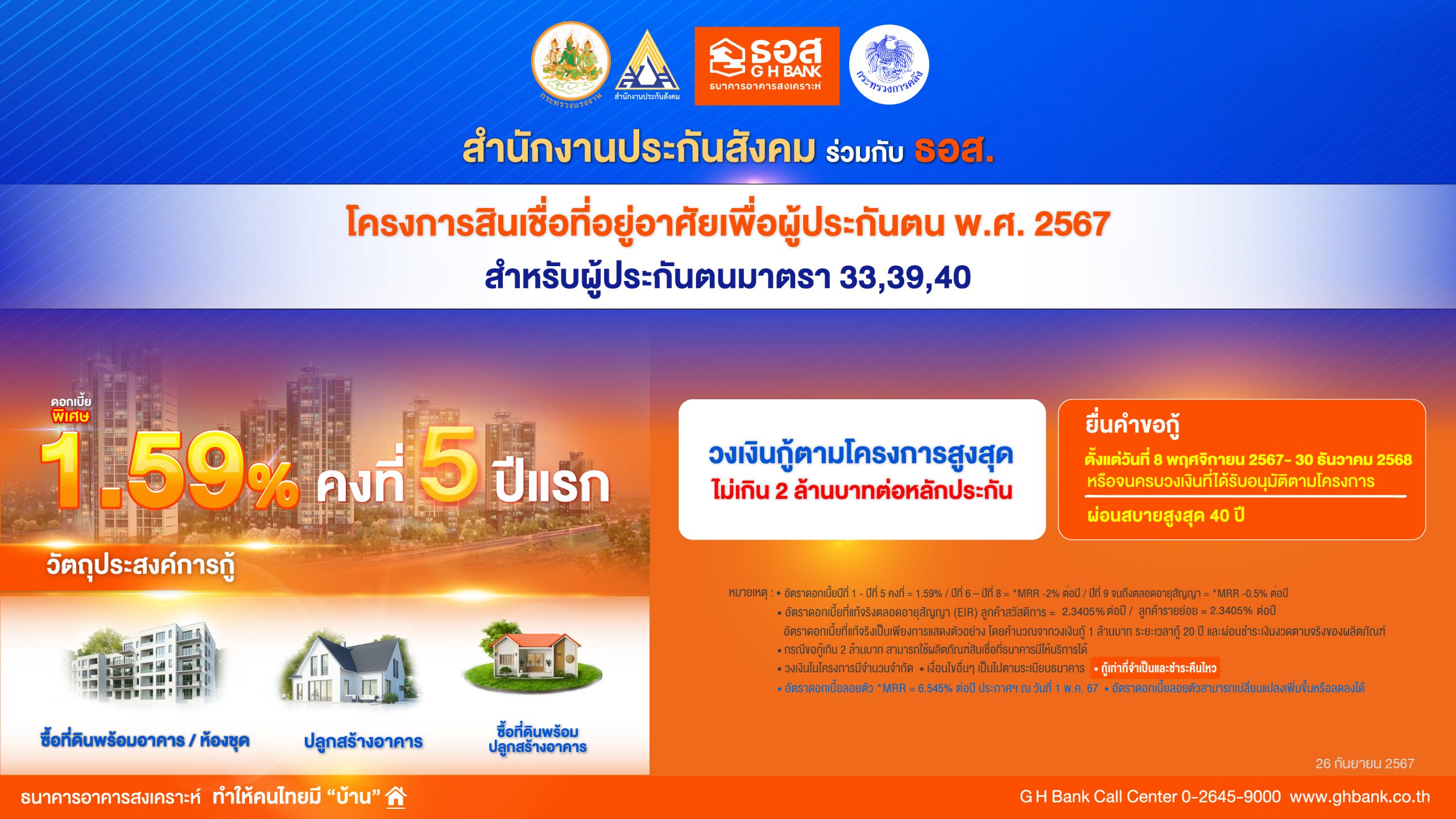 ธอส. ร่วมกับ สำนักงานประกันสังคม ลงนามบันทึกข้อตกลงความร่วมมือ จัดทำโครงการสินเชื่อที่อยู่อาศัยเพื่อผู้ประกันตน พ.ศ. 2567 กรอบวงเงิน 10,000 ล้านบาท ปล่อยสินเชื่ออัตราดอกเบี้ยต่ำ 5 ปีแรก เพียง 1.59% ต่อปี ให้กับผู้ประกันตนตามมาตรา 33, 39 หรือ 40 ที่ต้องการซื้อ หรือปลูกสร้างที่อยู่อาศัย ผ่อนคงที่นาน 5 ปี กรณีกู้ 1 ล้านบาท ผ่อนชำระเงินงวดเพียง 3,400 บาท เท่านั้น! ผู้ที่สนใจสามารถลงทะเบียนขอหนังสือรับรองสถานะความเป็นผู้ประกันตนจากสำนักงานประกันสังคม ได้ตั้งแต่วันที่ 1 พฤศจิกายน 2567 เป็นต้นไป เพื่อนำมาประกอบการยื่นขอสินเชื่อที่ ธอส. ทุกสาขาทั่วประเทศ ตั้งแต่วันที่ 8 พฤศจิกายน 2567 ถึงวันที่ 30 ธันวาคม 2568 หรือก่อนกำหนดระยะเวลาดังกล่าว หาก ธอส.ให้สินเชื่อเต็มกรอบวงเงินโครงการแล้ว