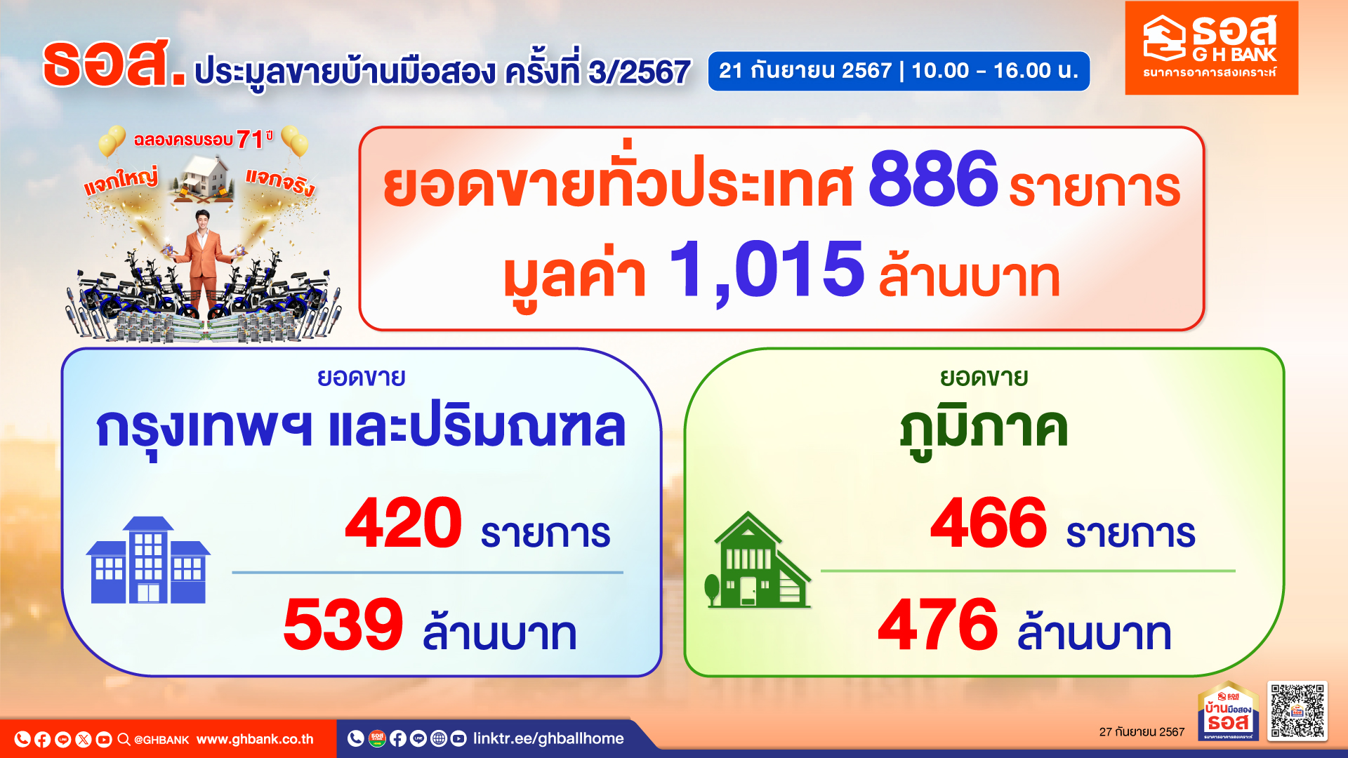 ธอส. เผยผลการจัดงานประมูลขายบ้านมือสอง จำหน่ายได้ 886 รายการ กว่า 1,015 ล้านบาท