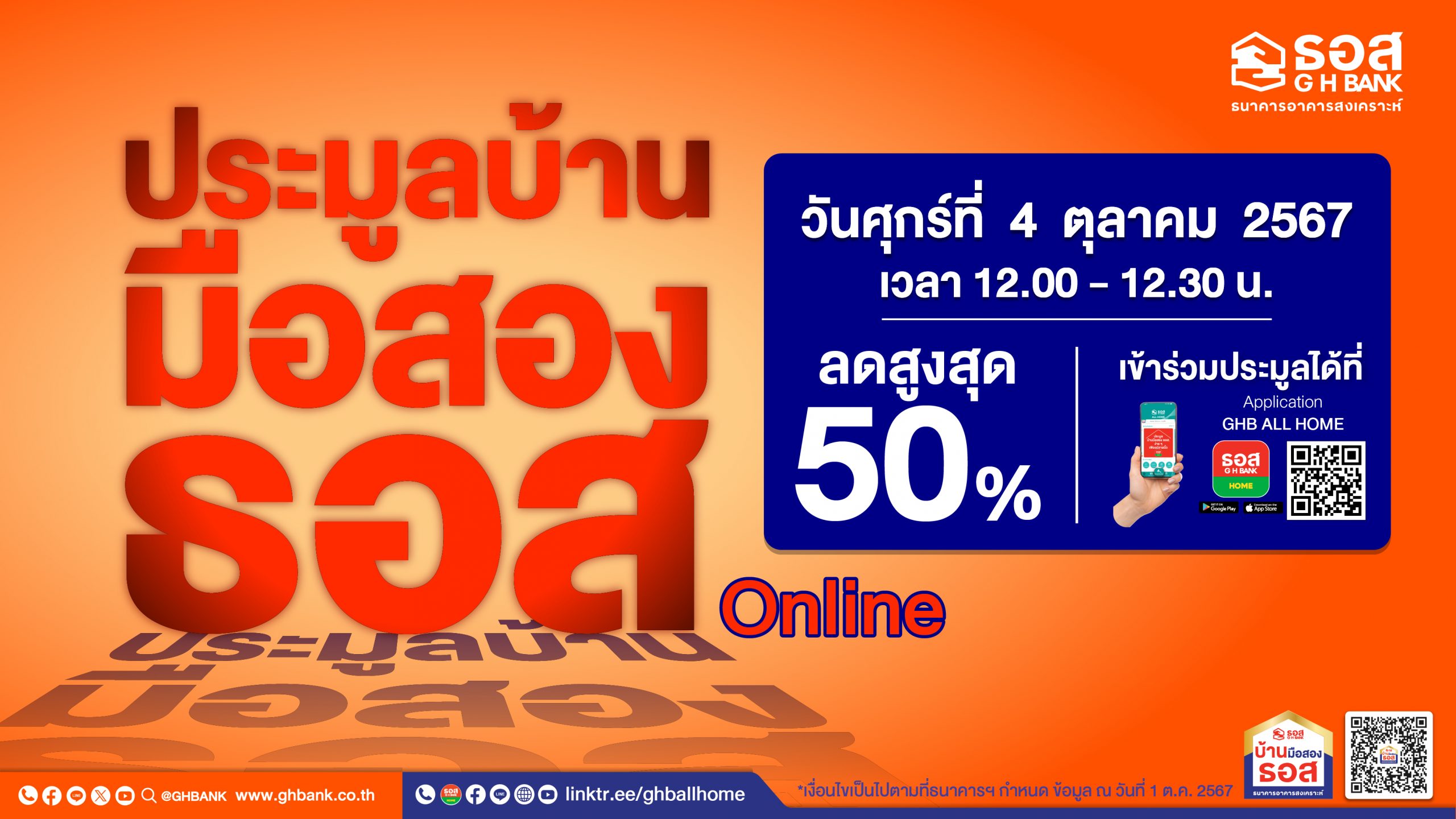 ธนาคารอาคารสงเคราะห์ นำทรัพย์เด่น ทำเลดี มากกว่า 1,300 รายการทั่วประเทศ เข้าร่วม “งานประมูลบ้านมือสองออนไลน์ : GHB’s NPA Online Auction 2024” ผ่าน Application : GHB ALL HOME วันที่ 4 ตุลาคม 2567 เวลา 12.00–12.30 น. พบทรัพย์ NPA ราคาพิเศษลดสูงสุด 50% จากราคาประเมิน บ้านเดี่ยวราคาต่ำสุดเริ่มต้นเพียง 230,000 บาท เท่านั้น พิเศษ! ผู้ชนะการประมูลรับโปรโมชันผลิตภัณฑ์ “สินเชื่อสำหรับซื้อทรัพย์ NPA พร้อมขายของธนาคาร” ด้วย