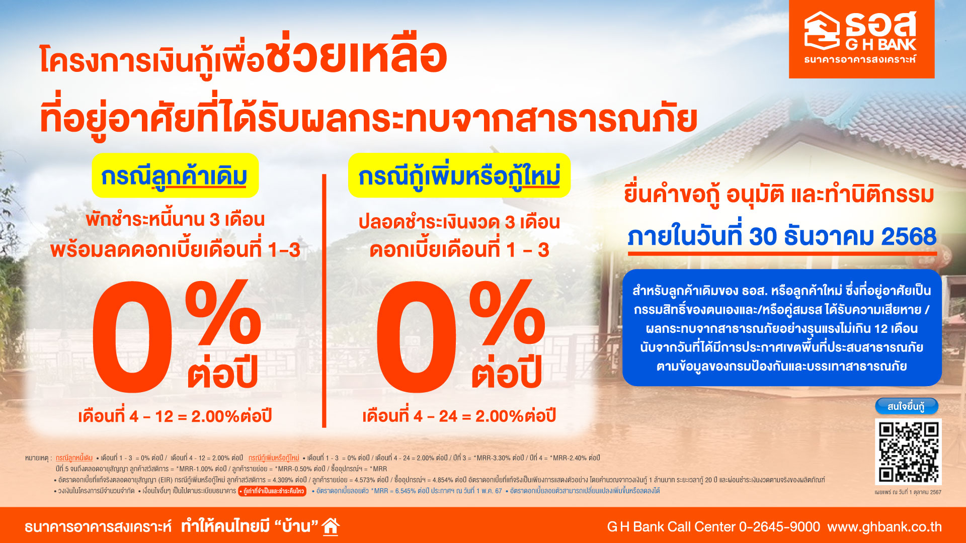 ตามที่รัฐบาลมีนโยบายเร่งด่วนผลักดันให้เกิดการปรับโครงสร้างหนี้ทั้งระบบ โดยเฉพาะกลุ่มสินเชื่อบ้าน ภายใต้ปรัชญาที่จะไม่ขัดต่อวินัยทางการเงินและไม่ทำให้เกิดภาวะภัยทางจริยธรรม (Moral Hazard) ของผู้มีภาระหนี้สิน โดยจะดำเนินการผ่านสถาบันการเงินของรัฐ ธนาคารอาคารสงเคราะห์ (ธอส.) ในฐานะสถาบันการเงินของรัฐ ขานรับนโยบายรัฐ เร่งให้ความช่วยเหลือประชาชนในพื้นที่ที่ได้รับผลกระทบจากสาธารณภัย ตามประกาศของกรมป้องกันและบรรเทาสาธารณภัย ด้วยการจัดทำ “โครงการเงินกู้เพื่อช่วยเหลือที่อยู่อาศัยที่ได้รับผลกระทบจากสาธารณภัย” สำหรับผู้ประสบอุทกภัยทุกพื้นที่ทั่วประเทศ โดยลูกค้าปัจจุบันสามารถขอลดเงินงวดและลดอัตราดอกเบี้ยเงินกู้เป็นระยะเวลา 1 ปี โดยพักชำระหนี้นาน 3 เดือน พร้อมลดอัตราดอกเบี้ยเงินกู้เหลือ 0% ต่อปี 3 เดือนแรก และเดือนที่ 4–12 คิดอัตราดอกเบี้ยเพียง 2.00% ต่อปี พร้อมลดเงินงวดลง 50% ของเงินงวดที่ชำระในปัจจุบัน และสำหรับลูกค้าปัจจุบันและลูกค้าใหม่ที่ต้องการกู้เพิ่มเพื่อซ่อมแซม หรือกู้เพื่อปลูกสร้างทดแทนหลังเดิม คิดอัตราดอกเบี้ย 0% พร้อมปลอดชำระเงินงวด 3 เดือนแรก และเดือนที่ 4–24 คิดอัตราดอกเบี้ย 2.00% ต่อปี ระยะเวลาการกู้ 40 ปี กู้ 1 ล้านบาท ผ่อนชำระเริ่มต้นเพียง 3,100 บาท ฟรีค่าประเมินราคาหลักประกัน และค่าธรรมเนียมจดทะเบียนการจำนอง ลูกค้าสามารถติดต่อขอเข้าร่วมโครงการได้ตั้งแต่วันนี้เป็นต้นไป ณ สาขาธนาคารทั่วประเทศ