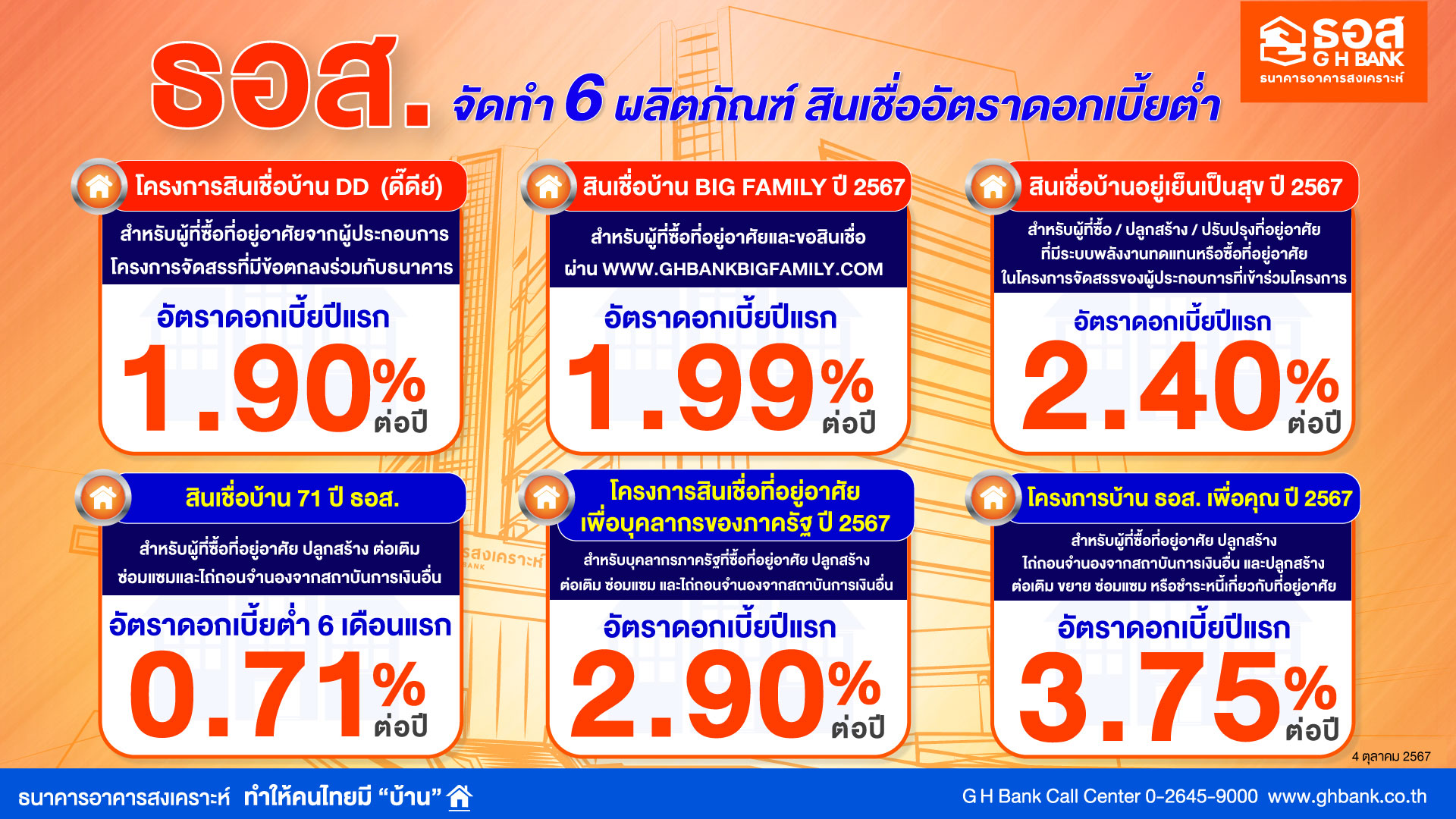 2.สินเชื่อบ้าน Big Family ปี 2567 สำหรับผู้ที่ต้องการซื้อบ้าน หรือคอนโดมิเนียมบนเว็บไซต์ ghbankbigfamily.com อัตราดอกเบี้ยปีแรก 1.99% ต่อปี ปีที่ 2 และ ปีที่ 3 เท่ากับ 3.15% ต่อปี (อัตราดอกเบี้ยเฉลี่ย 3 ปีแรก เท่ากับ 2.76%) ปีที่ 4 จนถึงตลอดอายุสัญญากรณีลูกค้ารายย่อย เท่ากับ MRR-0.50% ต่อปี กรณีลูกค้าสวัสดิการ เท่ากับ MRR-1.00% ต่อปี ระยะเวลาการกู้สูงสุด 40 ปี กรณีกู้ 1 ล้านบาท ผ่อนชำระเงินงวดเริ่มต้นเพียง 3,100 บาทต่อเดือน