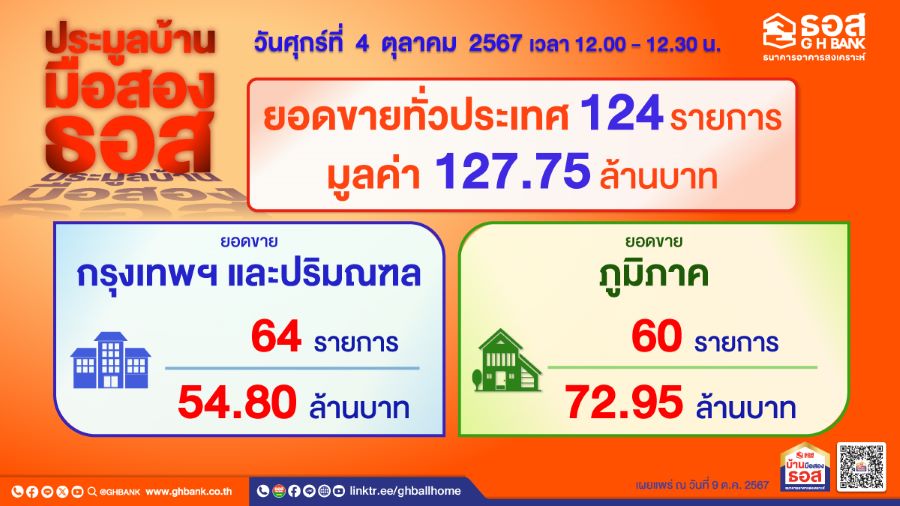 ธนาคารอาคารสงเคราะห์ (ธอส.) ทำให้คนไทยได้มีที่อยู่อาศัยเป็นของตนเองเพิ่มขึ้นกับบ้านมือสอง ธอส. โดยการจัด “งานประมูลบ้านมือสองออนไลน์ : GHB’S NPA Online Auction 2024” ประจำเดือนตุลาคม 2567 ซึ่งจัดขึ้นเมื่อวันศุกร์ที่ 4 ตุลาคม 2567 ระหว่างเวลา 12.00-12.30  น. พร้อมกันทั่วประเทศ ผ่าน Application : GHB ALL HOME โดยภายในงาน ธอส. สามารถจำหน่ายบ้านมือสองได้จำนวน 124 รายการ เป็นมูลค่ารวม 127.75 ล้านบาท แบ่งเป็น ทรัพย์ที่ตั้งอยู่ในพื้นที่กรุงเทพฯ และปริมณฑล จำนวน 64 รายการ รวมมูลค่า 54.80 ล้านบาท และในส่วนภูมิภาค จำนวน 60 รายการ รวมมูลค่า 72.95 ล้านบาท โดยรายการทรัพย์ที่ประมูลได้ในราคาต่ำที่สุดเพียง 305,000 บาท เป็นทรัพย์ประเภททาวน์เฮ้าส์ ขนาดเนื้อที่ 16.2 ตารางวา ในพื้นที่อำเภอธัญบุรี จังหวัดปทุมธานี และทรัพย์ที่ประมูลในราคาสูงสุด เป็นทรัพย์ประเภทบ้านเดี่ยว ขนาดเนื้อที่ 58.10 ตารางวา ในพื้นที่อำเภอเมืองสมุทรสาคร จังหวัดสมุทรสาคร โดยประมูลขายได้ในราคา 3,620,000 บาท พิเศษ! ผู้ชนะการประมูล สามารถใช้ “ผลิตภัณฑ์สินเชื่อสำหรับซื้อทรัพย์ NPA พร้อมขายของธนาคาร” (เงื่อนไขเป็นไปตามหลักเกณฑ์ที่ธนาคารกำหนด)