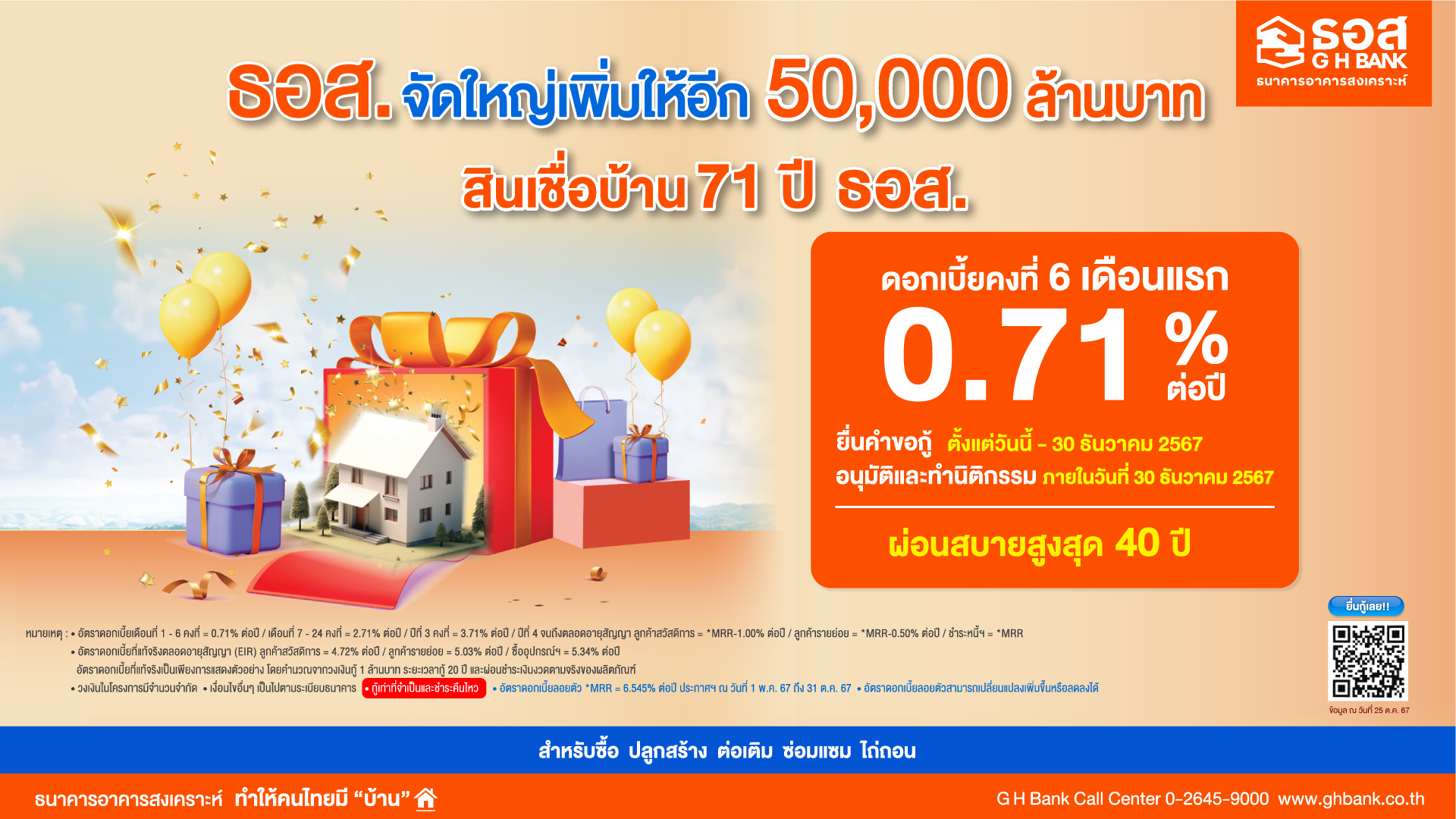 ธอส. เพิ่มโอกาสคนไทยให้มีที่อยู่อาศัยเป็นของตนเองมากขึ้น ด้วยการขยายกรอบวงเงินสินเชื่อบ้าน 71 ปี ธอส. อัตราดอกเบี้ยต่ำ 6 เดือนแรกเพียง 0.71% ต่อปี, เดือนที่ 7-24 เท่ากับ 2.71% ต่อปีปีที่ 3 เท่ากับ 3.71% ต่อปี เฉลี่ย 3 ปีแรก เท่ากับ 2.71% ต่อปี อีก 50,000 ล้านบาท เป็น 100,000 ล้านบาทหลังลูกค้าให้ความสนใจยื่นขอสินเชื่อใกล้เต็มกรอบวงเงินเดิมโดยผู้สนใจสามารถยื่นคำขอกู้ ณ สาขาธนาคารทั่วประเทศได้แล้วตั้งแต่วันนี้ และทำนิติกรรมภายในวันที่ 30 ธันวาคม 2567