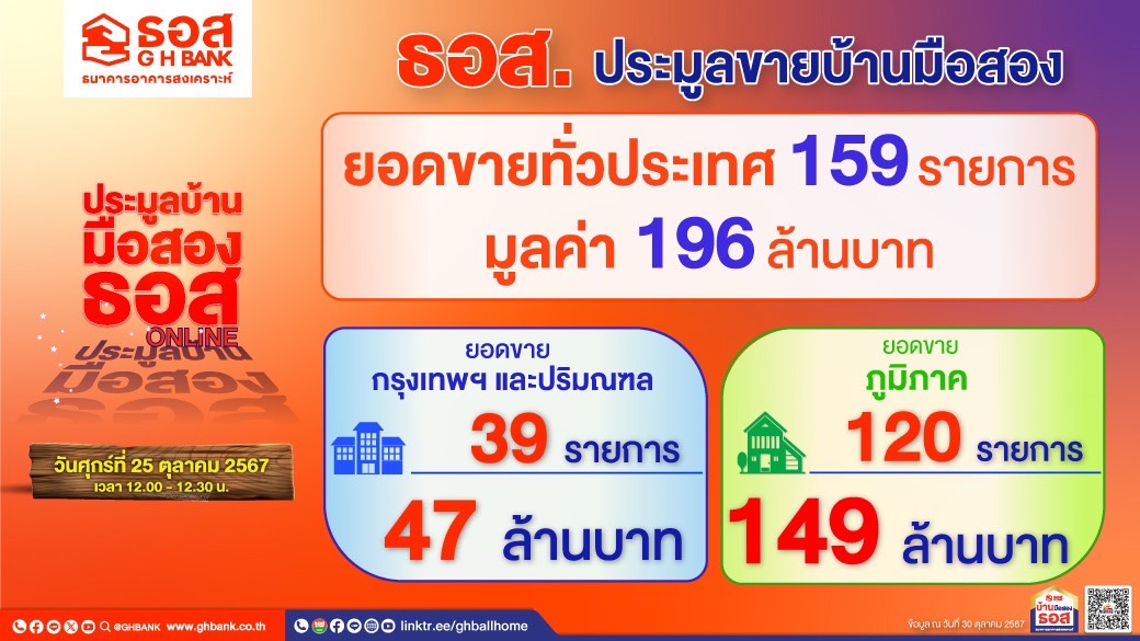 ธนาคารอาคารสงเคราะห์ (ธอส.) ทำให้คนไทยได้มีที่อยู่อาศัยเป็นของตนเองเพิ่มขึ้นกับบ้านมือสอง ธอส. โดยการจัด “งานประมูลบ้านมือสองออนไลน์ : GHB’S NPA Online Auction 2024” ซึ่งจัดขึ้นเมื่อวันศุกร์ที่ 25 ตุลาคม 2567 ระหว่างเวลา 12.00-12.30 น. พร้อมกันทั่วประเทศ ผ่าน Application : GHB ALL HOME