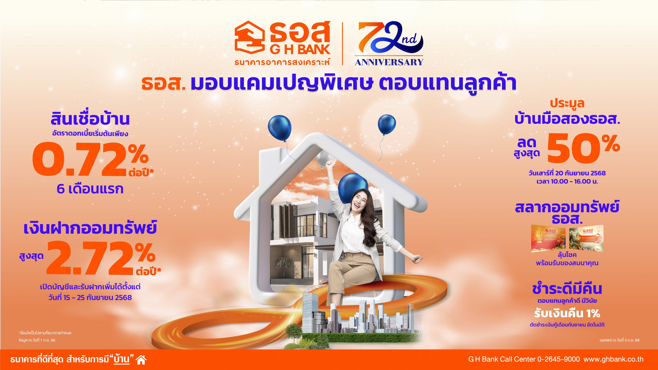 ธอส. ฉลองครบ 72 ปี จัดหนัก 5 แคมเปญกู้สินเชื่อบ้านดอกเบี้ยต่ำ 0.72% ต่อปี