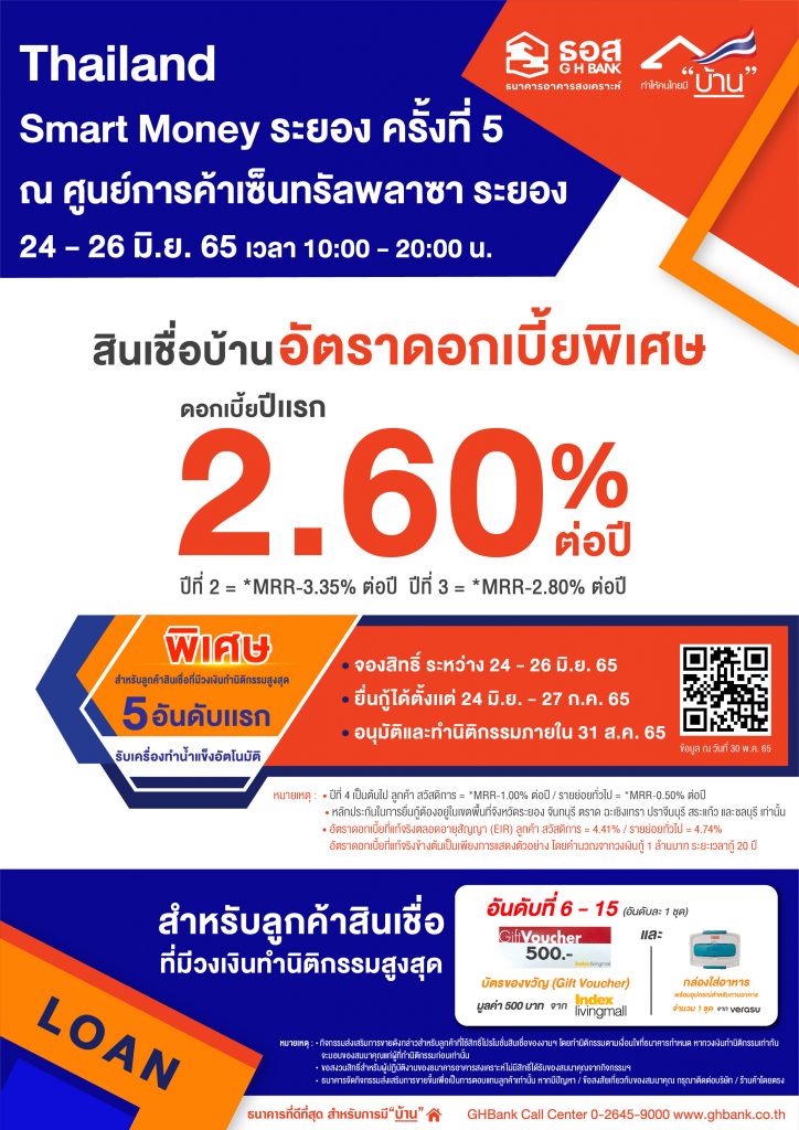 ธอส. ขนโปรโมชั่น สินเชื่อบ้านอัตราดอกเบี้ยคงที่ปีแรก 2.60% ต่อปี ร่วมงาน “Thailand Smart Money ระยอง ครั้งที่ 5”