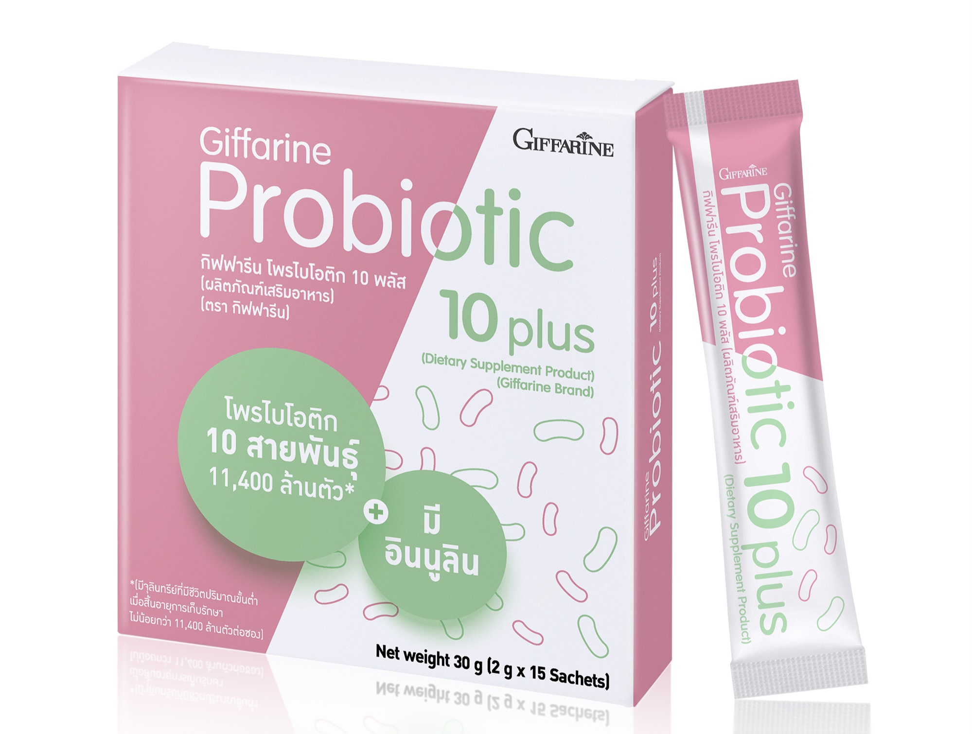 โพรไบโอติก นอกจากการดูแลตัวเองจากภายนอกแล้ว อย่าลืมว่าการดูแลสุขภาพจากภายในก็สำคัญไม่แพ้กัน โดยเฉพาะการเสริมสร้างภูมิคุ้มกันจากการดูแลลำไส้ ที่เป็นอวัยวะสำคัญอันดับต้นๆ วันนี้กิฟฟารีน จะพาทุกคนกลับมาดูแลสุขภาพของลำไส้และเสริมภูมิคุ้มกันด้วย กิฟฟารีน โพรไบโอติก 10 พลัส รสโยเกิร์ต ผลิตภัณฑ์เสริมอาหารมีจุลินทรีย์โพรไบโอติกถึง 10 สายพันธุ์ ที่คัดสรรมาแล้วว่าดีต่อลำไส้และร่างกาย ช่วยปรับสมดุลลำไส้ ส่งผลดีต่อผู้ที่มีอาการภูมิแพ้เพิ่มประสิทธิภาพการทำงานของระบบภูมิคุ้มกัน บรรจุ 15 ซอง(2 กรัม/ซอง) ราคา 790 บาท