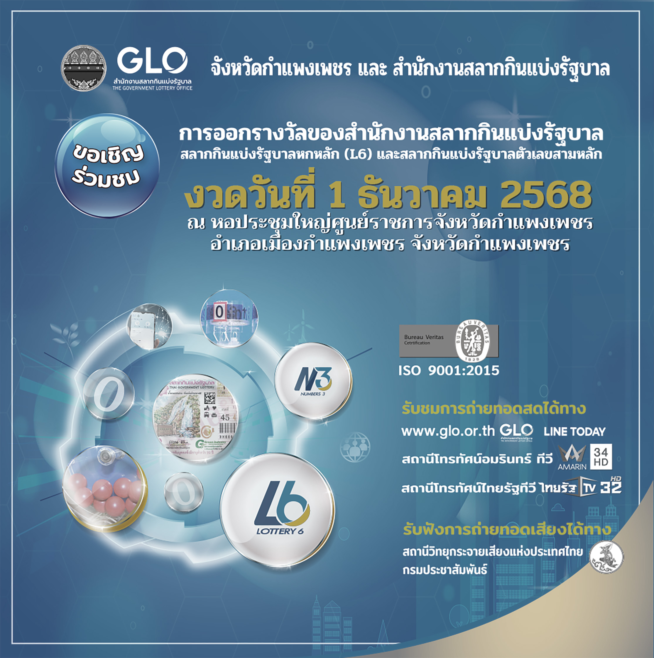 สำนักงานสลากกินแบ่งรัฐบาล พร้อมออกสลากสัญจร งวดวันที่ 1 ธันวาคม 2568 ที่จังหวัดกำแพงเพชร เพื่อเปิดโอกาสให้ประชาชนในพื้นที่ได้เข้าร่วมรับชมขั้นตอนการออกรางวัล เพื่อแสดงถึงความโปร่งใสในขั้นตอนและกระบวนการในการออกรางวัลที่ได้รับการรับรองมาตรฐาน ISO 9001:2015