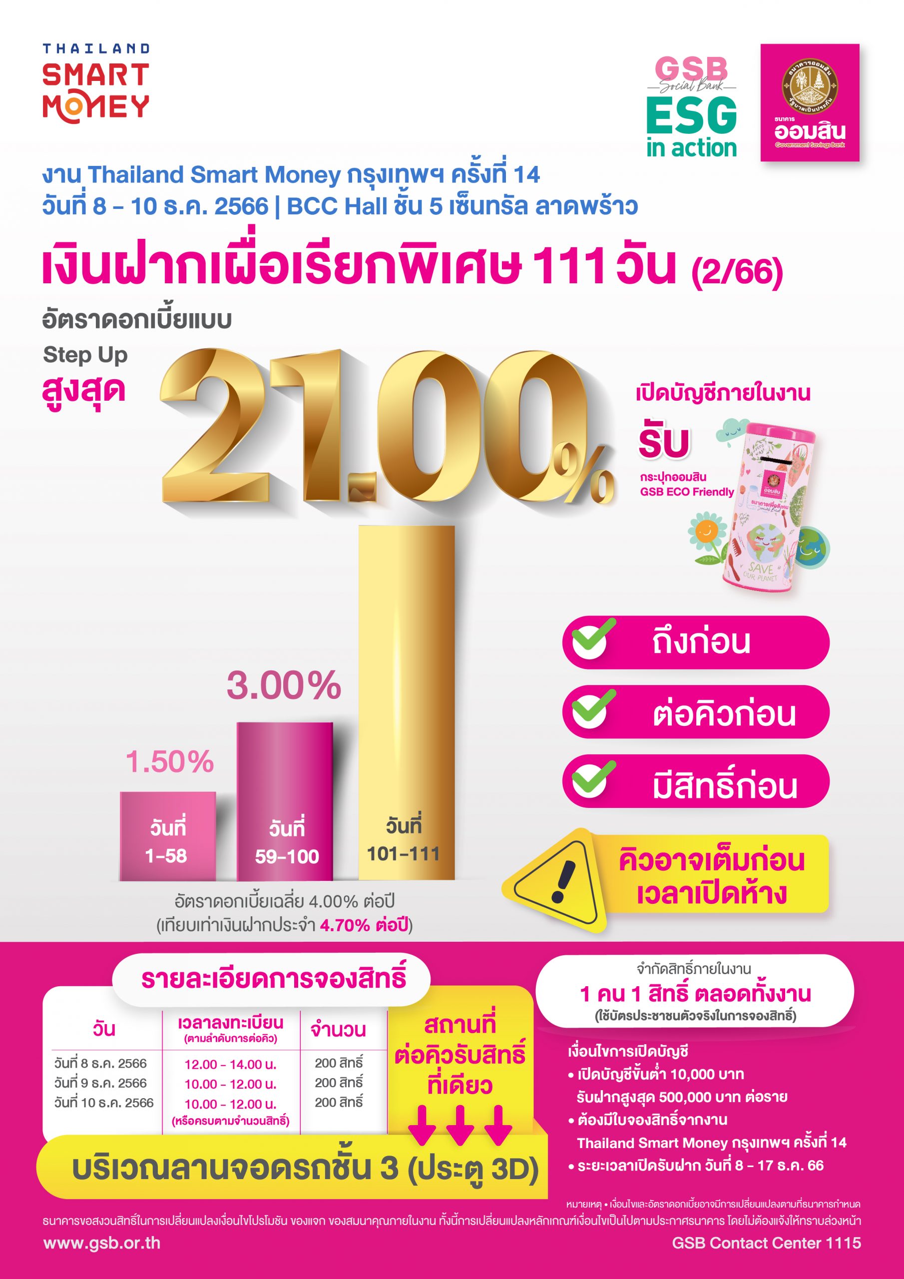 ออมสิน ชูเงินฝาก 111 วัน ดอกเบี้ยสูงสุด 21% ต่อปี เข้าร่วมงาน Thailand Smart Money