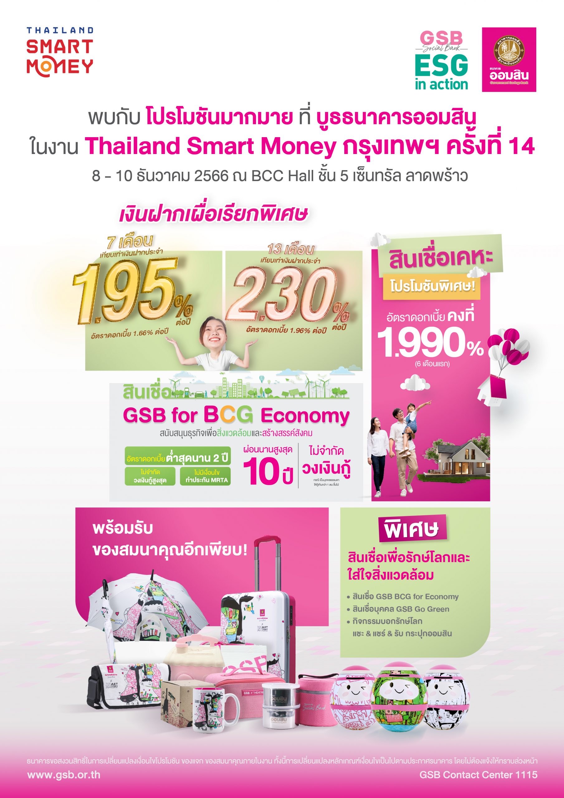ธนาคารออมสิน เข้าร่วมงาน Thailand Smart Money กรุงเทพฯ ครั้งที่ 14 จัดโปรโมชันน่าสนใจเข้าร่วมในงานนี้ ทั้งผลิตภัณฑ์เงินฝากส่งเสริมการออมสำหรับทุกวัย สินเชื่อบ้าน สินเชื่อบุคคล และสินเชื่อรักษ์โลก โดยผลิตภัณฑ์เงินฝากไฮไลท์ ได้แก่ เงินฝากเผื่อเรียกพิเศษ 111 วัน ระยะเวลาฝาก 111 วัน ดอกเบี้ย Step up สูงสุด 21.00% ต่อปี คิดเป็นอัตราดอกเบี้ยเฉลี่ย 4.00% ต่อปี ได้รับยกเว้นภาษี รับฝากเฉพาะบุคคลธรรมดา จำนวน 600 สิทธิ์ เปิดจองสิทธิ์ภายในงานเท่านั้น และ สลากออมสินพิเศษ 2 ปี จัดแคมเปญรอบใหม่ต่อเนื่อง ด้วยการเพิ่มรางวัลพิเศษมูลค่า 50 ล้านบาท 1 รางวัล และยังมีสิทธิ์ถูกรางวัลที่ 1 อีก 30 ล้านบาท รวมเงินรางวัลใหญ่ 80 ล้านบาท สำหรับผู้ฝากทั้งแบบใบสลากและดิจิทัล เริ่มฝากตั้งแต่บัดนี้เป็นต้นไป ถึงวันที่ 31 ม.ค. 2567 กำหนดจับรางวัลวันที่ 1 ก.พ. 2567