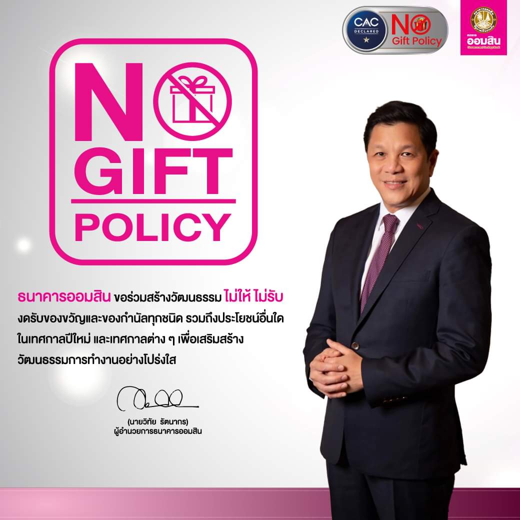 ธนาคารออมสิน ขอความร่วมมือ งดการให้ การรับ กระเช้าของขวัญหรือสิ่งตอบแทนรูปแบบใด ๆ แก่ผู้บริหาร พนักงาน และลูกจ้างธนาคารออมสิน รวมถึงผู้มีส่วนได้ส่วนเสียของธนาคารในทุกเทศกาล เพื่อแสดงเจตนารมณ์ในการเป็นองค์กรที่มีความโปร่งใส ปราศจากการทุจริต