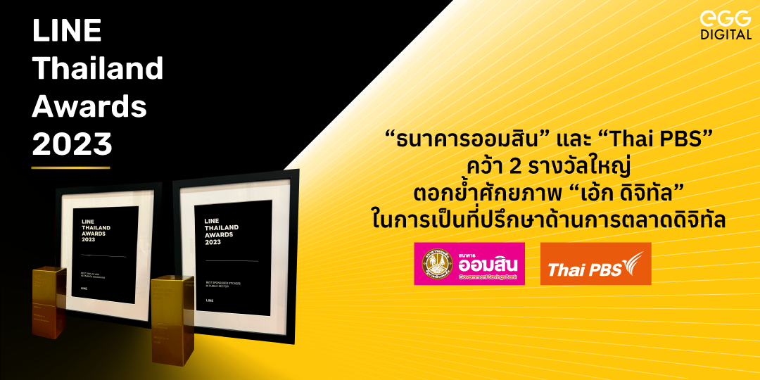 เอ้ก ดิจิทัล ผู้นำธุรกิจด้านวิเคราะห์ข้อมูลขนาดใหญ่ ให้บริการสื่อโฆษณาครบวงจรและการให้คำปรึกษาด้านการตลาดดิจิทัลสัญชาติไทย โชว์ความสำเร็จธุรกิจ MarTech Solution ใช้ศักยภาพด้าน AI,  แพลตฟอร์ม ดิจิทัล, มีเดียโซลูชัน และทีมผู้เชี่ยวชาญ สนับสนุน 2 พันธมิตรชั้นนำ “ธนาคารออมสิน” และ “Thai PBS” คว้า 2 รางวัลใหญ่ LINE THAILAND AWARDS 2023 ที่มอบรางวัลให้แก่แบรนด์ที่สร้างผลงานการตลาดยอดเยี่ยมบนแพลตฟอร์ม LINE โดย “ธนาคารออมสิน” คว้ารางวัล Best Display Ads และ “Thai PBS” คว้ารางวัล Best Sponsored Sticker ตอกย้ำการเป็นที่ปรึกษาด้านการตลาดดิจิทัลสำหรับทุกธุรกิจที่พร้อมเป็นผู้ช่วยผลักดันทุกองค์กรให้เติบโตเพิ่มศักยภาพการทำการตลาด และการสื่อสารที่ตอบโจทย์ความต้องการและไลฟ์สไตล์ของผู้บริโภคยุคใหม่