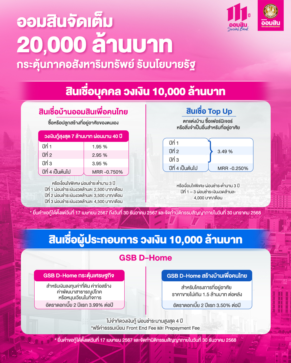 สำหรับผู้ประกอบการอสังหาริมทรัพย์ที่ต้องการมีเงินลงทุนเพื่อเสริมสภาพคล่อง ธนาคารได้ออก สินเชื่อกลุ่ม GSB D-HOME จำนวน 2 โครงการ วงเงินรวม 10,000 ล้านบาท ได้แก่ สินเชื่อ GSB D-HOME กระตุ้นเศรษฐกิจ ซึ่งเป็นสินเชื่อสำหรับให้ผู้ประกอบการนำไปเป็นเงินลงทุน เช่น เป็นค่าที่ดิน ค่าก่อสร้าง ค่าพัฒนาสาธารณูปโภค หรือเป็นเงินหมุนเวียนในกิจการ แต่จะต้องไม่เป็นการให้กู้เพื่อเก็งกำไรที่ดิน อัตราดอกเบี้ย 2 ปีแรกคงที่ 3.99% ต่อปี และ สินเชื่อ GSB D-HOME สร้างบ้านเพื่อคนไทย สำหรับการส่งเสริมกิจการโครงการที่อยู่อาศัยสำหรับผู้มีรายได้น้อย ราคาขายไม่เกิน 1.5 ล้านบาท/หลัง อัตราดอกเบี้ย 2 ปีแรกคงที่ 3.50% ต่อปี ทั้งนี้ไม่จำกัดวงเงินกู้ และระยะเวลากู้สูงสุดไม่เกิน 4 ปี พร้อมฟรีค่าธรรมเนียม Front End Fee และ Pre-Payment Fee โดยผู้ประกอบการที่สนใจสามารถยื่นคำขอกู้กับธนาคารออมสินได้ตั้งแต่วันที่ 17 เมษายน 2567 เป็นต้นไป และจัดทำนิติกรรมสัญญา ภายในวันที่ 30 ธันวาคม 2568