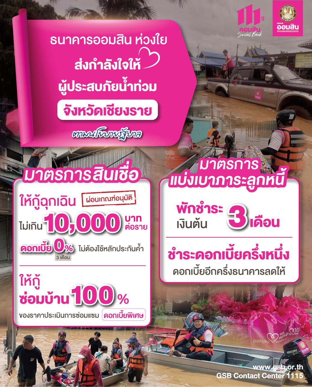 ทั้งนี้ ธนาคารออมสินได้ออกชุดมาตรการทางการเงินเพื่อลดภาระของผู้ประสบภัย ประกอบด้วย มาตรการพักหนี้และลดดอกเบี้ย โดยให้พักชำระเงินต้นและจ่ายดอกเบี้ยครึ่งหนึ่ง ส่วนดอกเบี้ยที่เหลืออีกครึ่งธนาคารลดให้ เป็นระยะเวลา 3 เดือน สำหรับลูกค้าสินเชื่อรายย่อย ทั้งบุคคล และ SMEs ที่มีวงเงินสินเชื่อไม่เกิน 10 ล้านบาท ไม่รวมลูกค้าสินเชื่อตามธุรกรรมนโยบายรัฐ (PSA) หรือโครงการผ่อนปรนอื่น ๆ โดยแจ้งความประสงค์ขอเข้ามาตรการผ่านทางเว็บไซต์ธนาคารออมสิน หรือติดต่อธนาคารออมสินในพื้นที่ได้ตั้งแต่วันนี้เป็นต้นไป นอกจากนี้ ยังมีมาตรการสินเชื่อฉุกเฉินเพื่อช่วยเหลือผู้ประสบภัยพิบัติ ผ่อนเกณฑ์อนุมัติ แบบไม่ต้องมีหลักประกันและไม่มีผู้ค้ำประกัน วงเงินกู้สูงสุดไม่เกินรายละ 10,000 บาท อัตราดอกเบี้ยคงที่ 0% ใน 3 เดือนแรก และปลอดชำระเงินงวดนาน 3 เดือน จากนั้นเดือนที่ 4 เป็นต้นไป อัตราดอกเบี้ย 0.60% และสินเชื่อเคหะแก่ผู้ประสบภัย สำหรับลูกค้าธนาคารออมสินและประชาชนทั่วไป ที่จำเป็นต้องซ่อมแซมบ้านเรือนที่อยู่อาศัยซึ่งได้รับความเสียหายจากน้ำท่วม วงเงินกู้สูงถึง 100% ของราคาประเมิน อัตราดอกเบี้ยลดพิเศษเฉลี่ย 3 ปีแรกอยู่ที่ 3.233% ต่อปี ปีที่ 1 อัตราดอกเบี้ย 2% ปีที่ 2 – 3 = 3.85% ต่อปี (MRR-2.745%) และปีที่ 4 เป็นต้นไป = 5.845% ต่อปี (MRR-0.750%)