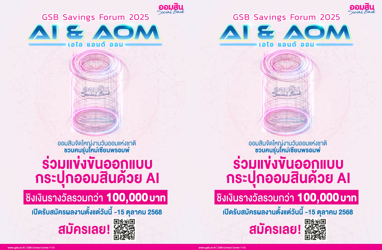 ธนาคารออมสิน เตรียมจัดงานใหญ่ GSB SAVINGS FORUM 2025 เนื่องในวันออมแห่งชาติ 31 ตุลาคม 2568 ภายใต้แนวคิด “AI & AOM ออมยุคใหม่ สร้างสังคมไทยให้ยั่งยืน” เพื่อเปิดเวทีแลกเปลี่ยนความคิดและประสบการณ์ด้านการออมในโลกดิจิทัล สะท้อนการผสานพลัง “AI” (Artificial Intelligence) เข้ากับ “AOM” (การออม) ในการสร้างวินัยทางการเงินและสังคมแห่งการออมที่ยั่งยืน หนึ่งในไฮไลท์สำคัญคือ กิจกรรมประกวดออกแบบ “กระปุกออมสินแห่งโลกยุคดิจิทัล” เชิญชวนคนรุ่นใหม่ร่วมสร้างสรรค์งานออกแบบผ่าน AI Generative Tools ถ่ายทอดแนวคิดการออมในมิติใหม่ พร้อมชิงเงินรางวัลมูลค่ารวม 110,000 บาท ตอกย้ำภารกิจสำคัญของธนาคารในการส่งเสริมการออมและสร้างวินัยทางการเงินอย่างต่อเนื่อง