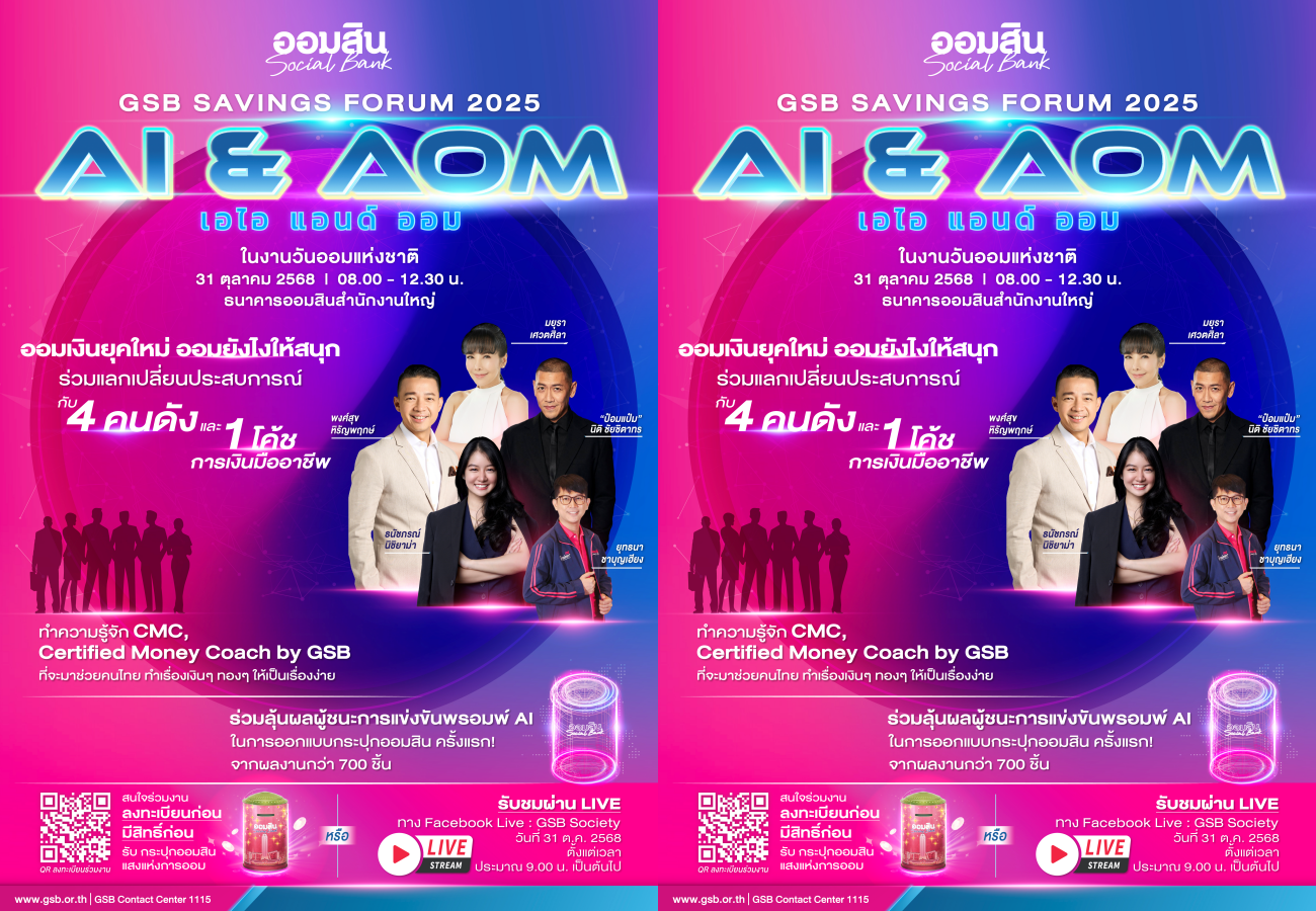 นางลภาวรรณ จันทร์กระจ่าง รองผู้อำนวยการธนาคารออมสิน รักษาการผู้อำนวยการธนาคารออมสิน เปิดเผยว่า ธนาคารออมสินในฐานะสถาบันการออมของคนไทย ตอกย้ำบทบาทผู้นำด้านการส่งเสริมการออมและให้ความรู้ทางการเงิน (Financial Literacy) กับประชาชนอย่างต่อเนื่อง โดยเฉพาะในยุคที่เทคโนโลยี AI เข้ามามีบทบาทสำคัญในชีวิตประจำวัน ธนาคารจึงถือโอกาสในการจัดงานวันออมแห่งชาติ วันที่ 31 ตุลาคม 2568 ยกระดับสู่ GSB SAVINGS FORUM 2025 ภายใต้แนวคิด “AI & AOM ออมยุคใหม่ สร้างสังคมไทยให้ยั่งยืน” เพื่อให้เป็นเวทีในการสื่อสารด้านการออมและจุดประกายการผสานพลังเทคโนโลยี “AI” (Artificial Intelligence) เข้ากับ “AOM” (การออม) อย่างสร้างสรรค์ผ่านกิจกรรมสำคัญ อาทิ มินิทอล์ก “ออมยุคใหม่ สร้างสังคมไทยให้ยั่งยืน” โดยกูรูและเซเลบริตี้ชื่อดัง การประกวดออกแบบ “กระปุกออมสินแห่งโลกยุคดิจิทัล” ด้วย AI รอบชิงชนะเลิศ ตลอดจนการเปิดตัว “โค้ชการเงินมืออาชีพ” หรือ CMC by GSB โดยงาน GSB SAVINGS FORUM 2025 ในครั้งนี้จัดขึ้นเป็นปีแรก และธนาคารตั้งเป้าจัดเป็นงานประจำทุกปีในวันออมแห่งชาติ เพื่อขับเคลื่อนภารกิจหลักของธนาคารในการให้ความรู้ทางการเงินและเป็นเวทีหลักด้านการส่งเสริมการออมแก่สังคมไทยอย่างต่อเนื่อง