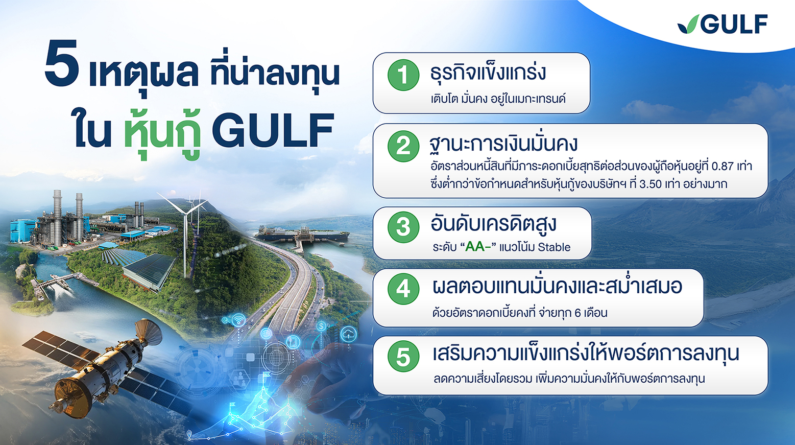“นอกจากนี้ หุ้นกู้ GULF ยังมีอันดับความน่าเชื่อถือที่ระดับ “AA-” แนวโน้ม “คงที่” (Stable) จัดอันดับโดยบริษัท ทริสเรทติ้ง จำกัด โดยทริสระบุว่า อันดับเครดิตดังกล่าวสะท้อนสถานะความเป็นผู้นำของบริษัทฯ ในธุรกิจผลิตไฟฟ้าภายในประเทศ รวมถึงการลงทุนในโครงการโรงไฟฟ้าขนาดใหญ่ที่มีการกระจายตัวดี และความสามารถในการสร้างกระแสเงินสดที่มั่นคงจากการมีสัญญาซื้อขายไฟระยะยาวจากทางภาครัฐ นอกจากนี้ การพิจารณาอันดับเครดิตยังคำนึงถึงรายได้จากเงินปันผล และส่วนแบ่งกำไรจำนวนมากที่บริษัทฯ ได้รับจากการลงทุนในหลายกิจการ โดยเฉพาะจากบริษัท แอดวานซ์ อินโฟร์ เซอร์วิส จำกัด (มหาชน) (ADVANC) ทั้งนี้ อันดับเครดิตดังกล่าวทำให้หุ้นกู้ GULF เป็นหุ้นกู้ที่มีศักยภาพในการชำระหนี้สูง รวมถึงให้ผลตอบแทนสม่ำเสมอ ด้วยอัตราดอกเบี้ยคงที่ โดยกำหนดจ่ายดอกเบี้ยทุกๆ 6 เดือน”