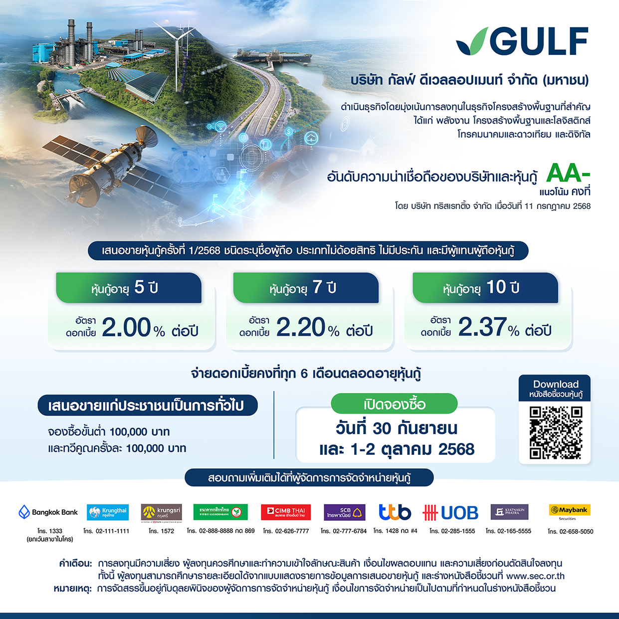 กัลฟ์ฯ ประกาศอัตราดอกเบี้ยหุ้นกู้ทั้ง 4 ชุด อายุหุ้นกู้ระหว่าง 3 -10 ปี โดยมีอัตราดอกเบี้ยคงที่ระหว่าง 1.76 – 2.37% ต่อปี พร้อมชี้ 5 เหตุผลที่ควรลงทุนกับ GULF 1) ธุรกิจมีความแข็งแกร่ง 2) ฐานะทางการเงินมีความมั่นคง 3) มีอันดับเครดิตสูงที่ “AA-” 4) ให้ผลตอบแทนมั่นคงและสม่ำเสมอ และ 5) เป็นเครื่องมือลงทุนที่เหมาะสมในภาวะเศรษฐกิจผันผวนและทิศทางดอกเบี้ยอยู่ในขาลง โดยหุ้นกู้ดังกล่าวพร้อมเสนอขายแก่ประชาชนทั่วไปและผู้ลงทุนสถาบัน ผ่านสถาบันการเงินชั้นนำ 10 แห่ง ระหว่างวันที่ 30 กันยายน และวันที่ 1-2 ตุลาคม 2568