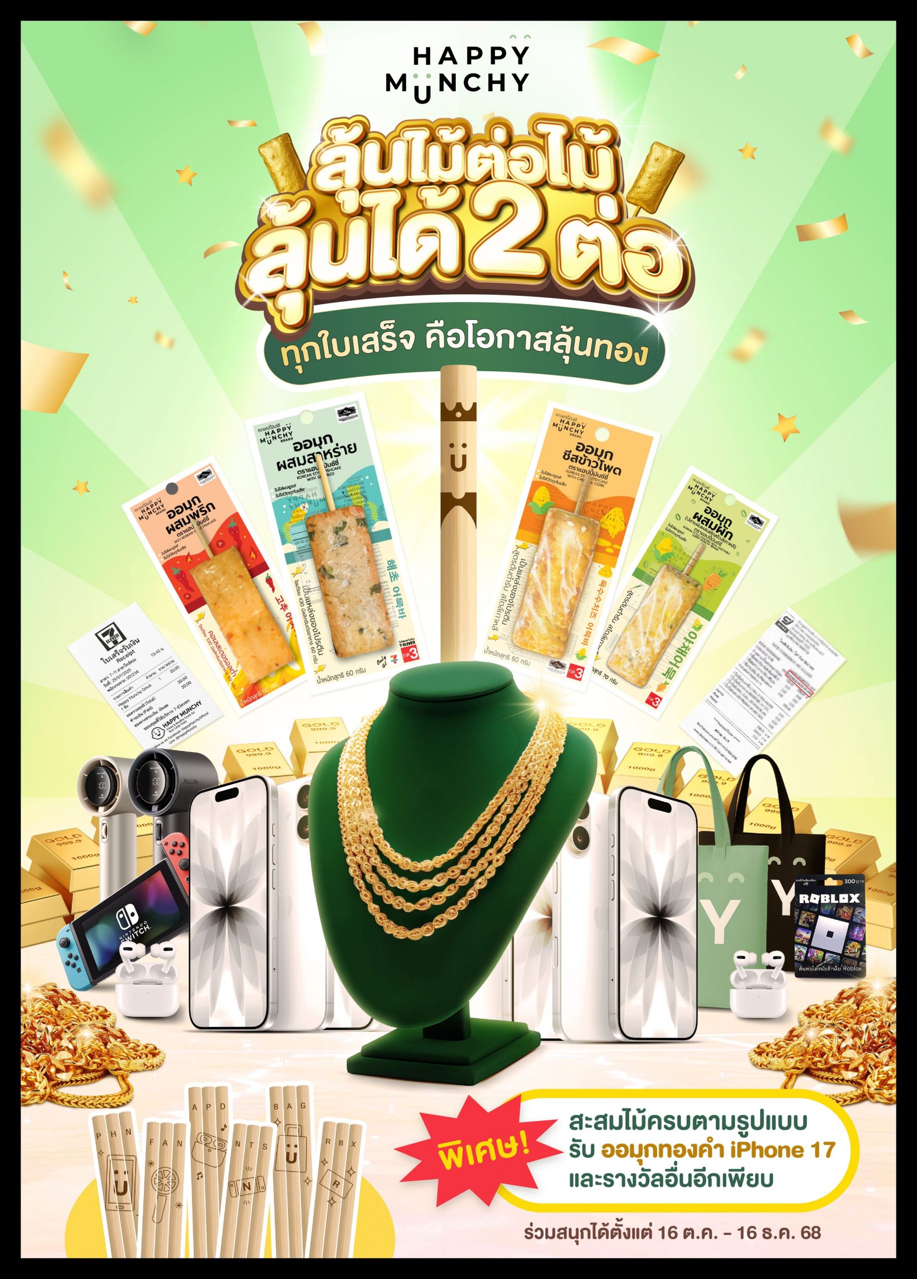 สำหรับแคมเปญ ลุ้นไม้ต่อไม้ ลุ้นได้ 2 ต่อ” Happy Munchy ฉลองครบรอบ 10 ปี จัดหนัก แจกจริง ทุกไม้ คือโอกาส ทุกใบเสร็จมีสิทธิ์ลุ้นทอง iPhone และของรางวัลอีกมากมาย โดยมีไฮไลท์ ต่อที่ 1: ทุกใบเสร็จจากการซื้อออมุก Happy Munchy จากร้านค้าที่ร่วมรายการ มีสิทธิ์ลุ้นสร้อยคอทองคํา และ ต่อที่ 2: สะสมไม้ให้ครบรูปแบบ ลุ้นรับของรางวัลใหญ่ทันที เช่น ออมุกทองคํา 1 บาท, iPhone 17, AirPods, Nintendo Switch และ ของรางวัลอื่นๆ กว่า 1,000 ชิ้น ตั้งแต่วันที่ 16 ตุลาคม–16 ธันวาคม 2568