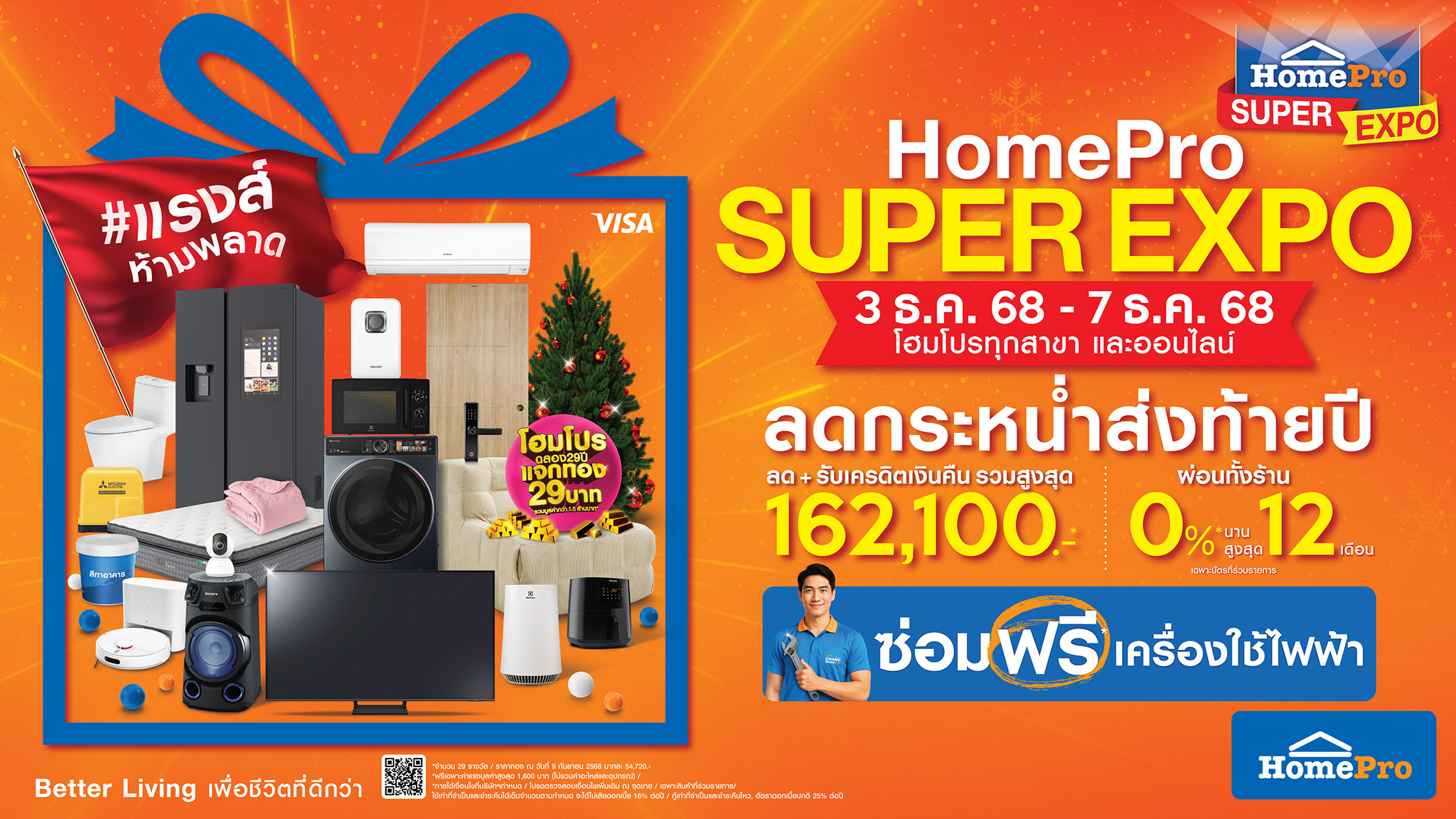 ปลายปีนี้คนรักบ้านห้ามพลาด! โฮมโปรจัดมหกรรมยิ่งใหญ่ส่งท้ายปี รวม 2 แคมเปญไว้ในครั้งเดียว “HomePro SUPER EXPO x CHANG HomePro ซ่อมฟรี! เครื่องใช้ไฟฟ้า” รวมทุกเรื่องบ้านไว้ในอีเวนต์เดียว เอาใจทั้งสายช้อป สายแต่งห้อง สายรักษ์โลก ด้วยกองทัพสินค้าตกแต่ง–ปรับปรุง–อัปเกรด มาครบทุกหมวดบ้าน พร้อมกิจกรรม “ซ่อมฟรี! เครื่องใช้ไฟฟ้า” ชวนหยิบเครื่องใช้ไฟฟ้าทุกรุ่น ทุกแบรนด์ มาซ่อมกับช่างโฮมโปร ฟรี! ค่าแรง 2 ชิ้นแรก/สมาชิกโฮมการ์ด แถมดีลบริการช่างให้จัดเต็ม ทั้ง ตรวจระบบไฟฟรี มูลค่า 3,000 บาท, ล้างแอร์โปรแรง 399 บาท (แจกเฉพาะช่วงเช้า) และส่วนลดบริการซ่อม–ปรับปรุงบ้านสูงสุด 39% พร้อมเสิร์ฟคุ้มต่อกับ SUPER SHOCK !! ให้ทั้งลด ทั้งรับเงินคืน ลุ้นทอง ผ่อน 0% และแฟลชเซลล์ออนไลน์ ครบ จบ ในงานเดียว ระหว่างวันที่ 3–7 ธันวาคม 2568 ที่โฮมโปรทุกสาขาทั่วประเทศ และโฮมโปรออนไลน์ เพียง 5 วันเท่านั้น–ไม่พลาดทุกดีลเด็ดส่งท้ายปี ในงาน HomePro SUPER EXPO !!
