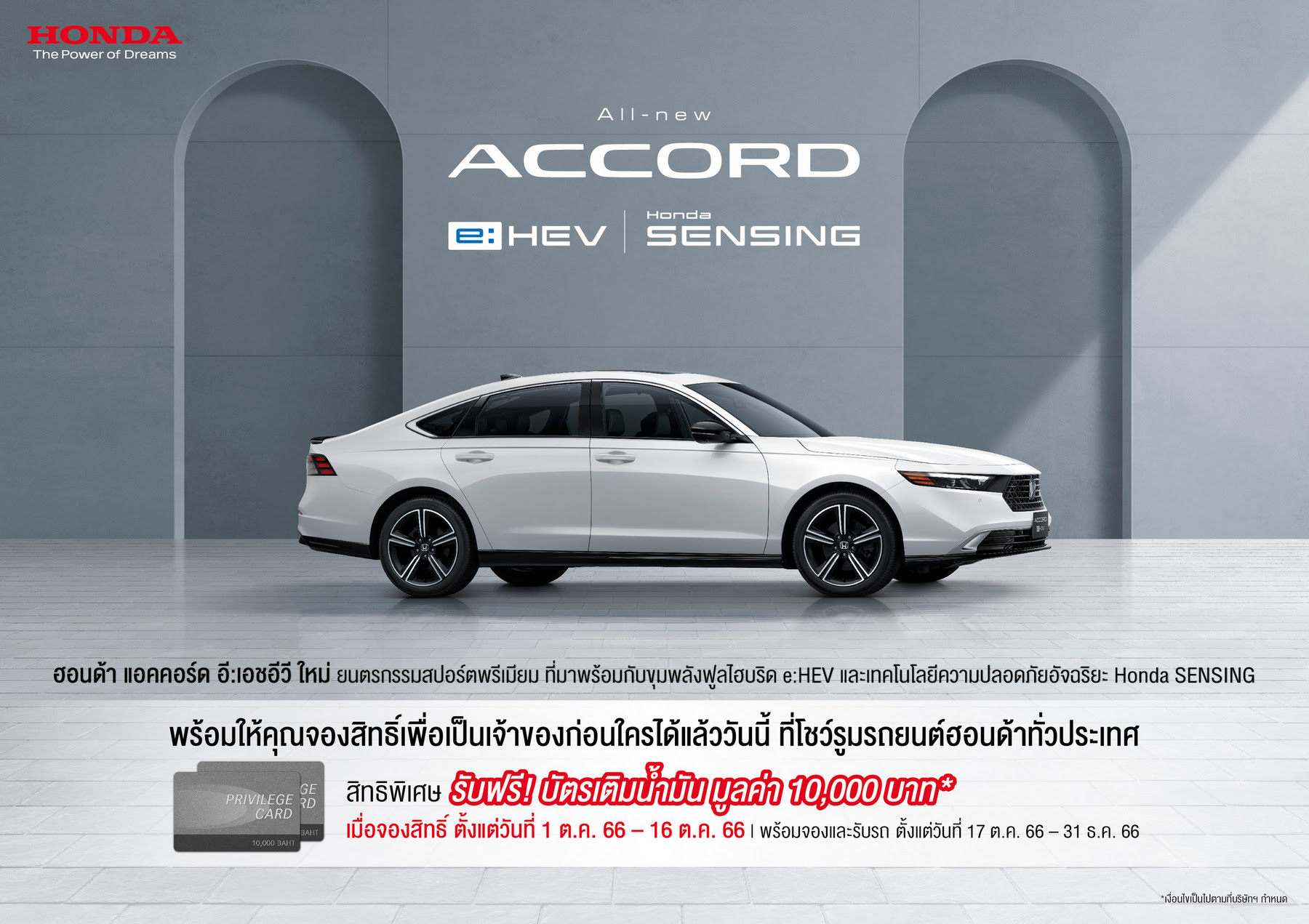 พิเศษ สำหรับลูกค้าที่สนใจเป็นเจ้าของ ฮอนด้า แอคคอร์ด อี:เอชอีวี ใหม่ ก่อนใคร สามารถลงทะเบียนจองสิทธิ์ได้ ตั้งแต่วันที่ 1 ตุลาคม 2566 ตั้งแต่เวลา 10.00 น. – วันที่ 16 ตุลาคม 2566 เวลา 22.00 น.** โดยสามารถจองสิทธิ์ผ่านที่ปรึกษาการขายฮอนด้า หรือที่โชว์รูมฮอนด้าทั่วประเทศ พร้อมรับฟรีบัตรเติมน้ำมันมูลค่า 10,000 บาท** เมื่อจองและรับรถภายในระยะเวลาที่บริษัทฯ กำหนด**