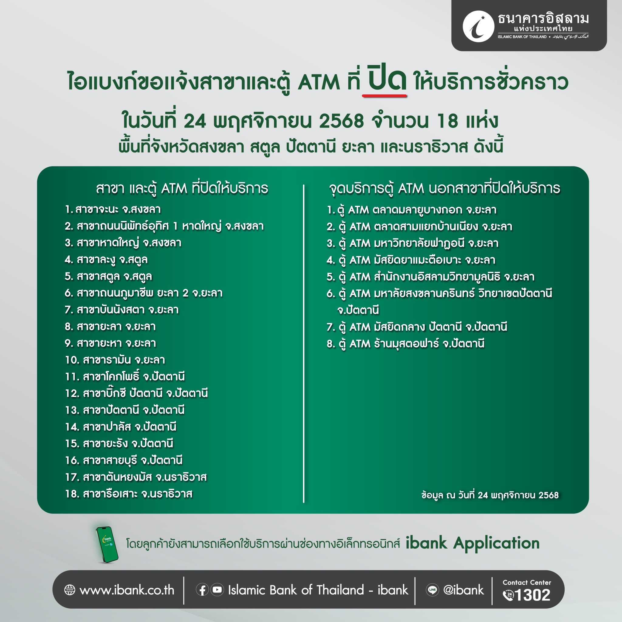 นายธีระ ยีโกบ ผู้ช่วยกรรมการผู้จัดการ ผู้บริหารกลุ่มงานธุรกิจสาขา เปิดเผยว่า ธนาคารมีความห่วงใยอย่างยิ่งต่อสถานการณ์น้ำท่วมในพื้นที่ภาคใต้ ซึ่งส่งผลกระทบต่อการเดินทางและความปลอดภัยในชีวิตและทรัพย์สินของพี่น้องประชาชน เพื่อความปลอดภัยสูงสุด ธนาคารจึงมีความจำเป็นต้องปิดให้บริการสาขาและตู้ ATM เป็นการชั่วคราว ในวันจันทร์ที่ 24 พฤศจิกายน 2568 จำนวน 18 แห่ง ในพื้นที่จังหวัดสงขลา สตูล ยะลา ปัตตานี และนราธิวาส โดยสาขาและตู้ ATM ดังกล่าวจะกลับมาเปิดให้บริการตามปกติในวันอังคารที่ 25 พฤศจิกายน 2568 หรือจนกว่าจะมีประกาศเปลี่ยนแปลง
