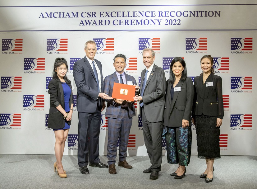 นายแอนโทนี วาตานาเบ ประธานเจ้าหน้าที่บริหารด้านความยั่งยืน อินโดรามา เวนเจอร์ส (ที่ 3 จากซ้าย) เป็นตัวแทนผู้รับมอบรางวัลจาก นายโรเบิร์ต เอฟ โกเดค เอกอัครราชทูตสหรัฐอเมริกาประจำประเทศไทย (ที่ 3 จากขวา) และนาย เจฟฟรีย์ ไนการ์ด ประธานหอการค้าอเมริกันในประเทศไทย (ที่ 2 จากซ้าย) ณ โรงแรมคอนราด กรุงเทพฯ