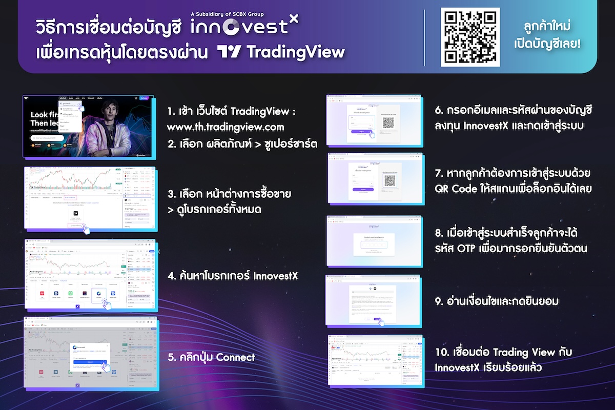 สำหรับลูกค้า InnovestX ที่สนใจเทรดบน TradingView ผ่านบัญชีลงทุน InnovestX สามารถเริ่มใช้งานได้ผ่านทางเว็บไซต์ TradingView โดยทำการเชื่อมต่อบัญชีลงทุน InnovestX กับบัญชีผู้ใช้งาน TradingView เมื่อเชื่อมต่อสำเร็จจะสามารถซื้อขายหุ้นไทย โดยตรงบนแพลตฟอร์ม TradingView สำหรับลูกค้าใหม่ที่สนใจ สามารถเปิดบัญชีลงทุน InnovestX และทำตามขั้นตอนดังกล่าวเพื่อใช้งานได้เช่นกัน พร้อมทั้งสามารถเข้าร่วมกิจกรรม “Mission to the Top” รับสิทธิ์เข้าคอร์สเรียนการลงทุน คอร์สการใช้เครื่องมือ TradingView และ คอร์สการบริหารจัดการความเสี่ยงด้านการลงทุน รวมกว่า 15 คอร์ส ฟรีตลอดระยะเวลากิจกรรม เพื่อเตรียม ความพร้อมก่อนเข้าร่วมกิจกรรมแข่งเทรด และมีสิทธิ์ได้รับแพ็คเกจพรีเมียมใช้งานฟรีตลอด 1 ปี ที่จะขยายขอบเขตการใช้งานเครื่องมือให้มากยิ่งขึ้น หรือมีสิทธิ์ได้รับ iPhone 15 ความจุ 256 GB สี Titanium และของรางวัลอีกมากมาย นักลงทุนที่สนใจสามารถ ร่วมกิจกรรม ‘Mission to the Top’ ได้ตั้งแต่วันที่ 19 ธันวาคม 2566 – 31 มกราคม 2567