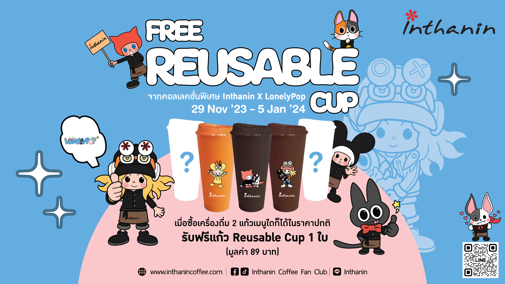 อินทนิล เปิดตัว คอลเลคชั่น Inthanin x LonelyPop โดยการนำคาแรคเตอร์การ์ตูนดังระดับโลกฝีมือคนไทย คุณน้อยหน่า-สุริยา อุทัยรัศมี มาอยู่ในแก้ว Reusable Cup สีเครื่องดื่มยอดฮิตของอินทนิล 5 สี 5 ลาย เพียงซื้อเครื่องดื่มอินทนิลเมนูใดก็ได้ 2 แก้วขึ้นไปต่อ 1 ใบเสร็จ รับฟรีแก้ว Reusable Cup มูลค่า 89 บาท ตั้งแต่วันนี้ ถึง 5 มกราคม 2567 (หรือจนกว่าสินค้าจะหมด) ณ ร้านอินทนิลที่ร่วมรายการ โดยเปิดให้สะสมสัปดาห์ละ 1 สี 1 ลาย เปิดตัวก่อน 3 ลาย ให้แฟนๆ ได้เก็บสะสม และจะเพิ่มความน่ารักอีก 2 ลายตามมา ดังนี้