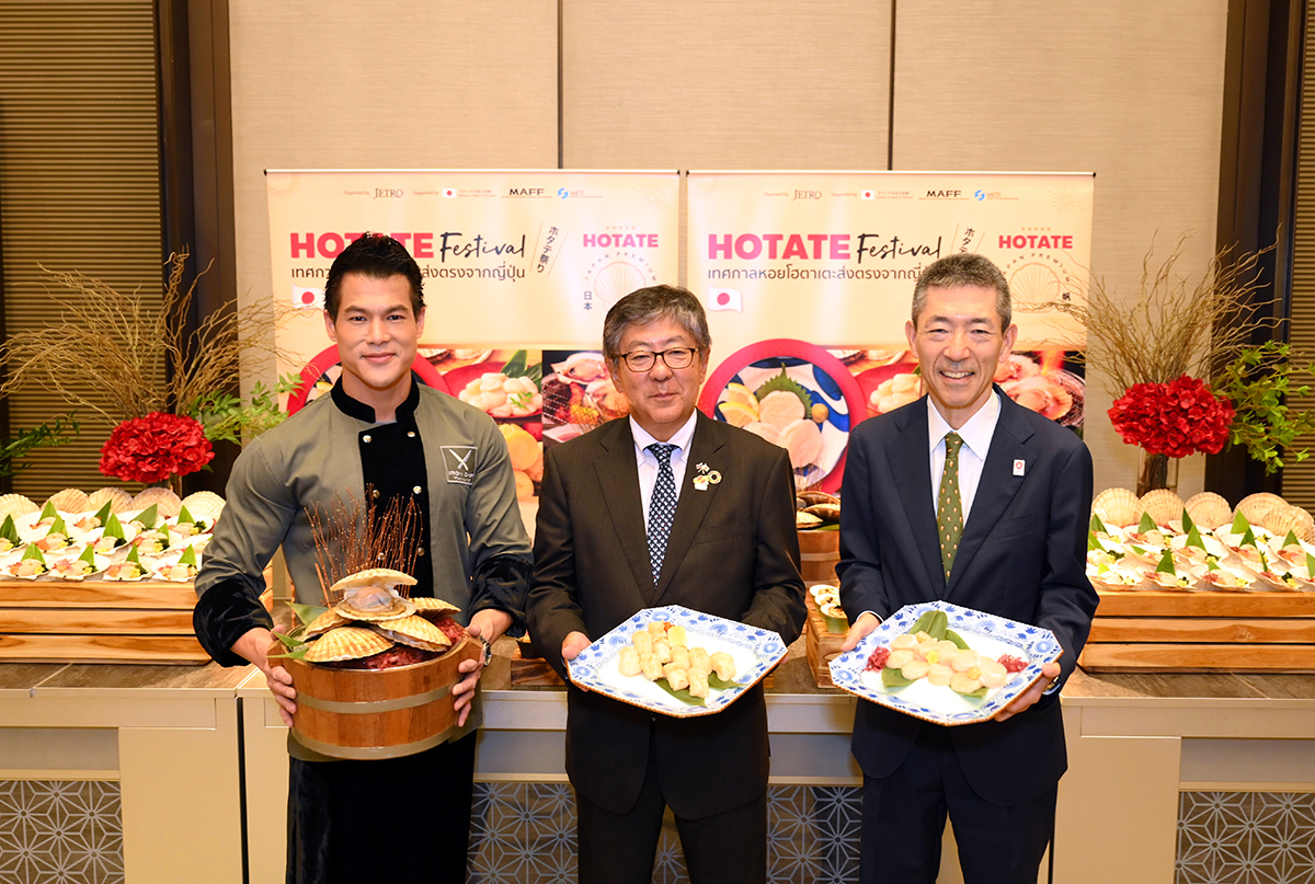 องค์การส่งเสริมการค้าต่างประเทศของญี่ปุ่น กรุงเทพฯ ซึ่งมีหน้าที่ส่งเสริมการส่งออกผลิตภัณฑ์เกษตร ป่าไม้ การประมง และอาหารจากประเทศญี่ปุ่นมายังประเทศไทย เปิดตัวแคมเปญใหญ่แห่งปี HOTATE Festival เทศกาลหอยโฮตาเตะส่งตรงจากญี่ปุ่น เพื่อประชาสัมพันธ์ให้ผู้บริโภคในประเทศไทยรู้จักหอยเชลล์โฮตาเตะพรีเมียมจากญี่ปุ่นมากยิ่งขึ้น พร้อมกระตุ้นการบริโภคหอยเชลล์โฮตาเตะร่วมกับวัตถุดิบอื่นๆ ในอาหารหลากหลายประเภท และเพลิดเพลินไปกับการบริโภคหอยโฮตาเตะนำเข้าได้โดยที่ไม่ต้องบินไปไกลถึงประเทศญี่ปุ่น โดยมุ่งส่งเสริมกิจกรรมร่วมกับผู้นำเข้าสินค้า ผู้ประกอบการธุรกิจร้านอาหารและร้านค้าปลีกในประเทศไทย เพื่อขยายช่องทางการจำหน่ายสินค้าอาหารนำเข้าในตลาดกลุ่มใหม่ๆ ในประเทศไทยแบบเต็มสูบ