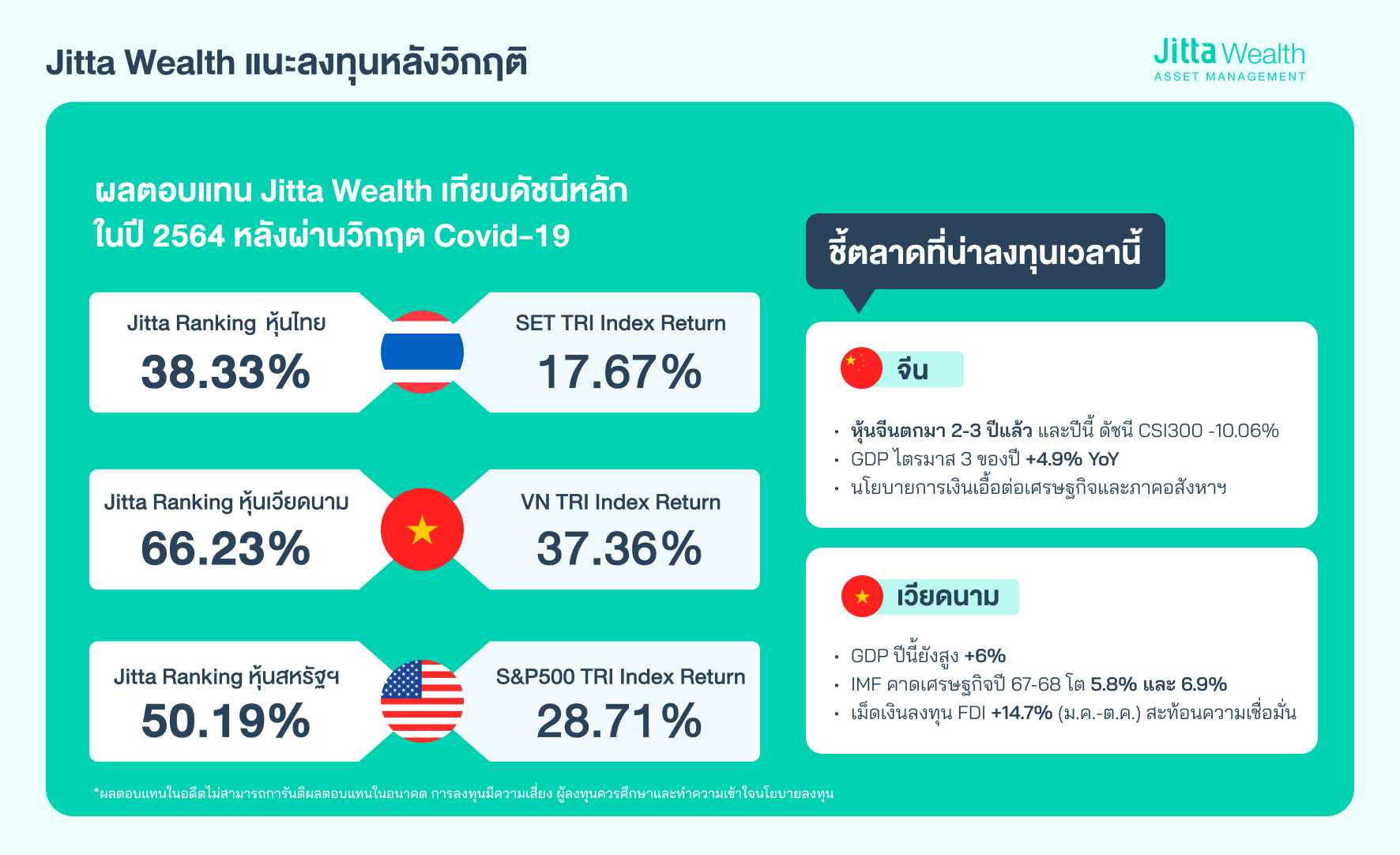 จิตตะ เวลธ์ จำกัด แนะลงทุนช่วงวิกฤติ เพื่อคว้าโอกาสที่ดีที่สุดหลังตลาดฟื้นตัว ชี้หุ้นจีน-เวียดนามเวลานี้เหมาะเข้าลงทุนเพื่อรับโอกาสใน 1-2 ปีข้างหน้า เหตุในช่วงวิกฤติมีหุ้นดีให้เลือกมากมาย หลังนักลงทุนเทขายหุ้นไม่สนราคา เห็นได้จากกองทุนส่วนบุคคล Jitta Ranking ที่ยึดหลักเลือกหุ้นดีราคาถูกตามหลัก VI หลังผ่านวิกฤติโควิด-19 ก็สร้างผลตอบแทนเหนือตลาด เผยปี 64 Jitta Ranking หุ้นสหรัฐฯ สร้างผลตอบแทนได้ถึง 50.19% เอาชนะดัชนี S&P500 ที่ 28.71% ขณะที่ Jitta Ranking หุ้นไทย สร้างผลตอบแทนเฉลี่ย 38.33% เหนือกว่า SET Index ที่ 17.67% และ Jitta Ranking เวียดนามสร้างผลตอบแทนเฉลี่ย 66.23% สูงกว่า VN Index ที่ทำได้ 37.36% ตอกย้ำว่าการลงทุนช่วงวิกฤติคือโอกาส พร้อมเดินหน้าพัฒนาอัลกอริทึมต่อเนื่องเพื่อช่วยนักลงทุนเข้าถึงการลงทุนระยะยาวด้วยหุ้นดีราคาเหมาะสม