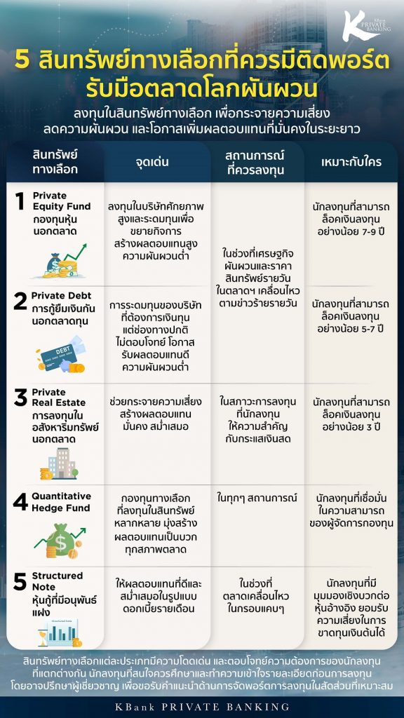 สินทรัพย์ทางเลือกที่ KBank Private Banking แนะนำประกอบไปด้วย 5 สินทรัพย์ประเภท โดยแบ่งเป็นสินทรัพย์นอกตลาด 3 ประเภท และสินทรัพย์ในตลาดที่มีความยืดหยุ่นในการกลยุทธ์การลงทุนอีก 2 ประเภท ดังนี้