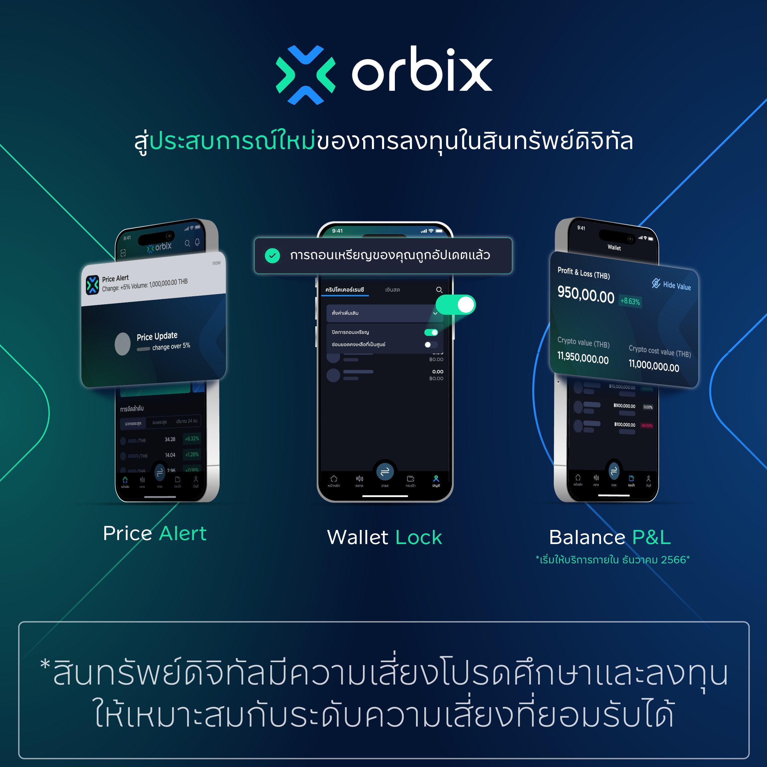 3. “orbix” พัฒนาฟีเจอร์ที่เปรียบเสมือนเครื่องมือและข้อมูลที่ช่วยในการลงทุน (Smart) ได้แก่ Price Alert ตั้งเตือนราคาที่ใช่ ไม่ต้องเฝ้าจอ ไม่พลาดทุกโอกาสการซื้อขาย โดยสามารถเลือกเหรียญที่ต้องการให้แจ้งเตือนได้ด้วยตนเอง และ orbix Balance** ระบบช่วยคำนวณต้นทุนเหรียญแบบอัตโนมัติ ทำให้รู้กำไรขาดทุนทุกเหรียญ โดยไม่ต้องเสียเวลาคำนวณ (** หมายเหตุ: ฟีเจอร์ orbix Balance จะสามารถเริ่มใช้งานได้ภายในเดือนธันวาคม 2566 การคำนวณใน orbix Balance เป็นการคำนวณเบื้องต้นจากข้อมูลตลาดแบบเรียลไทม์และข้อมูลต้นทุนของผู้ใช้งาน โดยการคำนวณเหล่านี้ไม่ใช่การให้คำแนะนำทางการเงินหรือแนวคิดแนะนำใด ๆ)