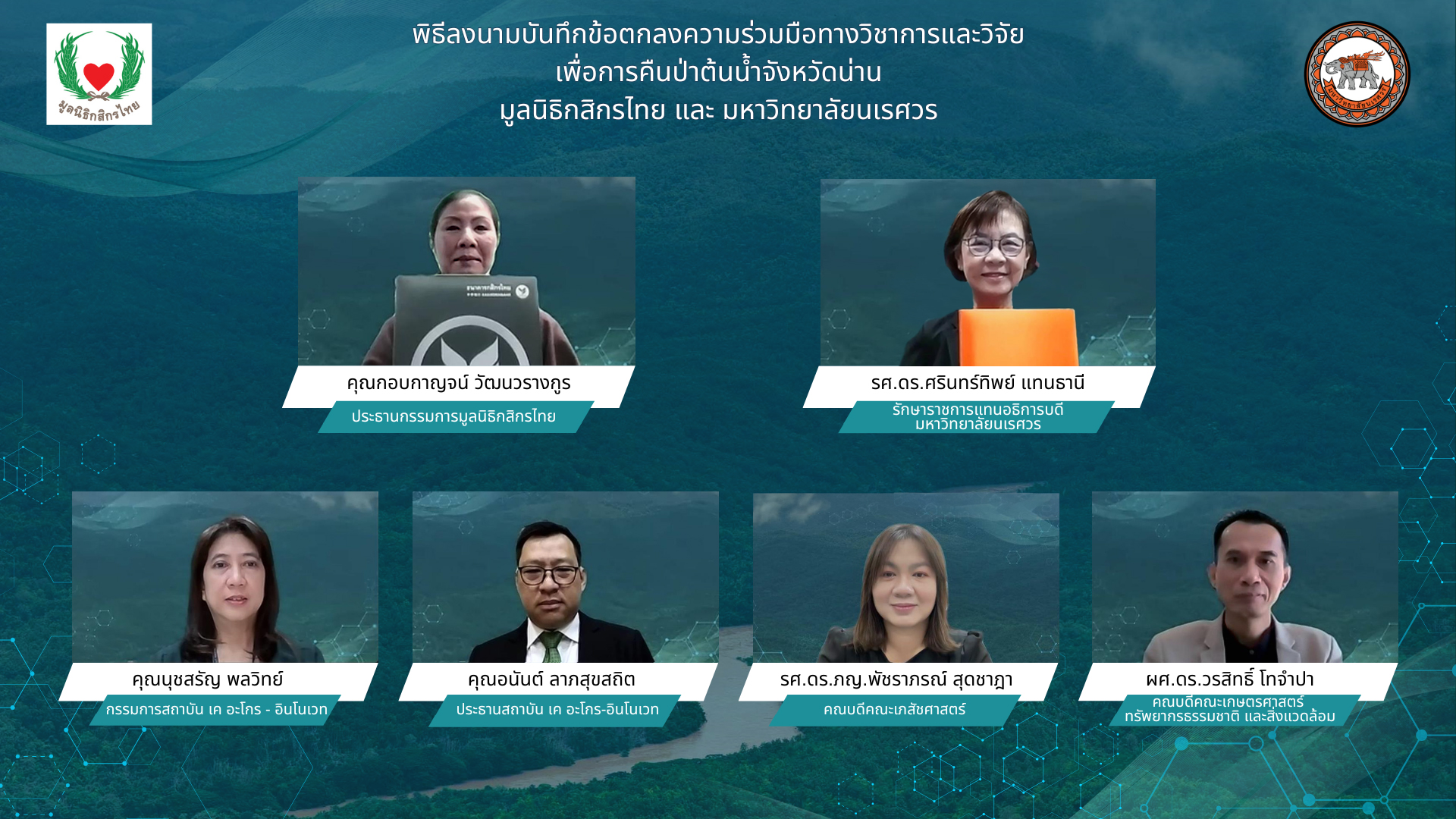 พิธีลงนามในบันทึกข้อตกลงความร่วมมือทางวิชาการและวิจัย (MOU) ระหว่างมูลนิธิกสิกรไทย กับมหาวิทยาลัยนเรศวรในครั้งนี้ มีวัตถุประสงค์เพื่อวิจัยและพัฒนาเทคโนโลยีที่สอดคล้องกับพันธกิจของมหาวิทยาลัยนเรศวร และตรงตามเป้าหมายของมูลนิธิ เพื่อนำผลการวิจัยและพัฒนาเทคโนโลยีไปสู่การดำเนินการในเชิงพาณิชย์ตามเป้าหมายของมูลนิธิ รวมถึงยกระดับรายได้ให้แก่ชุมชนในจังหวัดน่าน พร้อมกับการช่วยฟื้นคืนพื้นที่ป่าน่าน อันเป็นป่าต้นน้ำที่มีคุณค่ายิ่งของประเทศและของโลกได้อย่างดีเยี่ยม โดยมี นายอนันต์ ลาภสุขสถิต (แถวล่างที่ 2 จากซ้าย) ประธานสถาบัน เค อะโกร-อินโนเวท นางสาวนุชสรัญ พลวิทย์ (แถวล่างที่ 1 จากซ้าย) กรรมการสถาบัน เค อะโกร-อินโนเวท พร้อมด้วย รศ.ดร.ภญ.พัชราภรณ์ สุดชาฎา (แถวล่างที่ 2 จากขวา) คณบดีคณะเภสัชศาสตร์ และ ผศ.ดร.วรสิทธิ์ โทจำปา (แถวล่าง ที่ 1 จากขวา) คณบดีคณะเกษตรศาสตร์ ทรัพยากรธรรมชาติ และสิ่งแวดล้อม มหาวิทยาลัยนเรศวร ร่วมพิธีลงนาม เมื่อเร็ว ๆ นี้