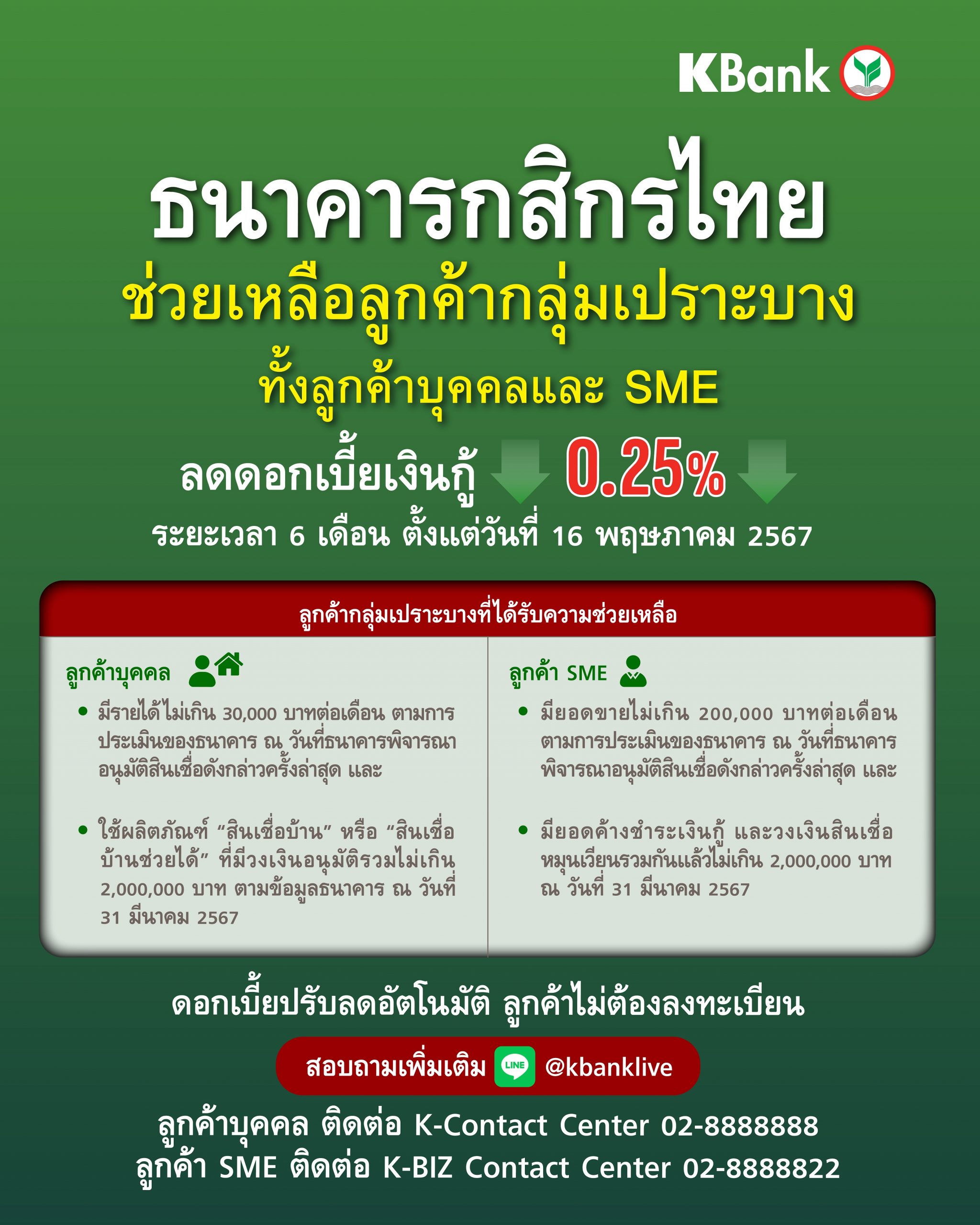 ทั้งนี้ลูกค้ากลุ่มเปราะบางที่ได้รับการพิจารณาจากธนาคารในโครงการความช่วยเหลือนี้จะได้รับการปรับลดดอกเบี้ยแบบอัตโนมัติ โดยไม่มีค่าธรรมเนียมใดๆ และไม่ต้องลงทะเบียน ซึ่งธนาคารจะดำเนินการส่ง SMS แจ้งให้ลูกค้าท่านนั้นทราบ (โดยไม่มีการแนบ Link) ตามเบอร์โทรศัพท์ที่ได้ให้ไว้กับธนาคาร และสามารถสอบถามรายละเอียดเพิ่มเติมได้ที่ LINE @kbanklive หรือลูกค้าบุคคลติดต่อได้ที่ K-Contact Center 02-8888888 ลูกค้า SME ติดต่อได้ที่ K-BIZ Contact Center 02-8888822 ได้ตั้งแต่วันที่ 16 พฤษภาคม 2567 เป็นต้นไป