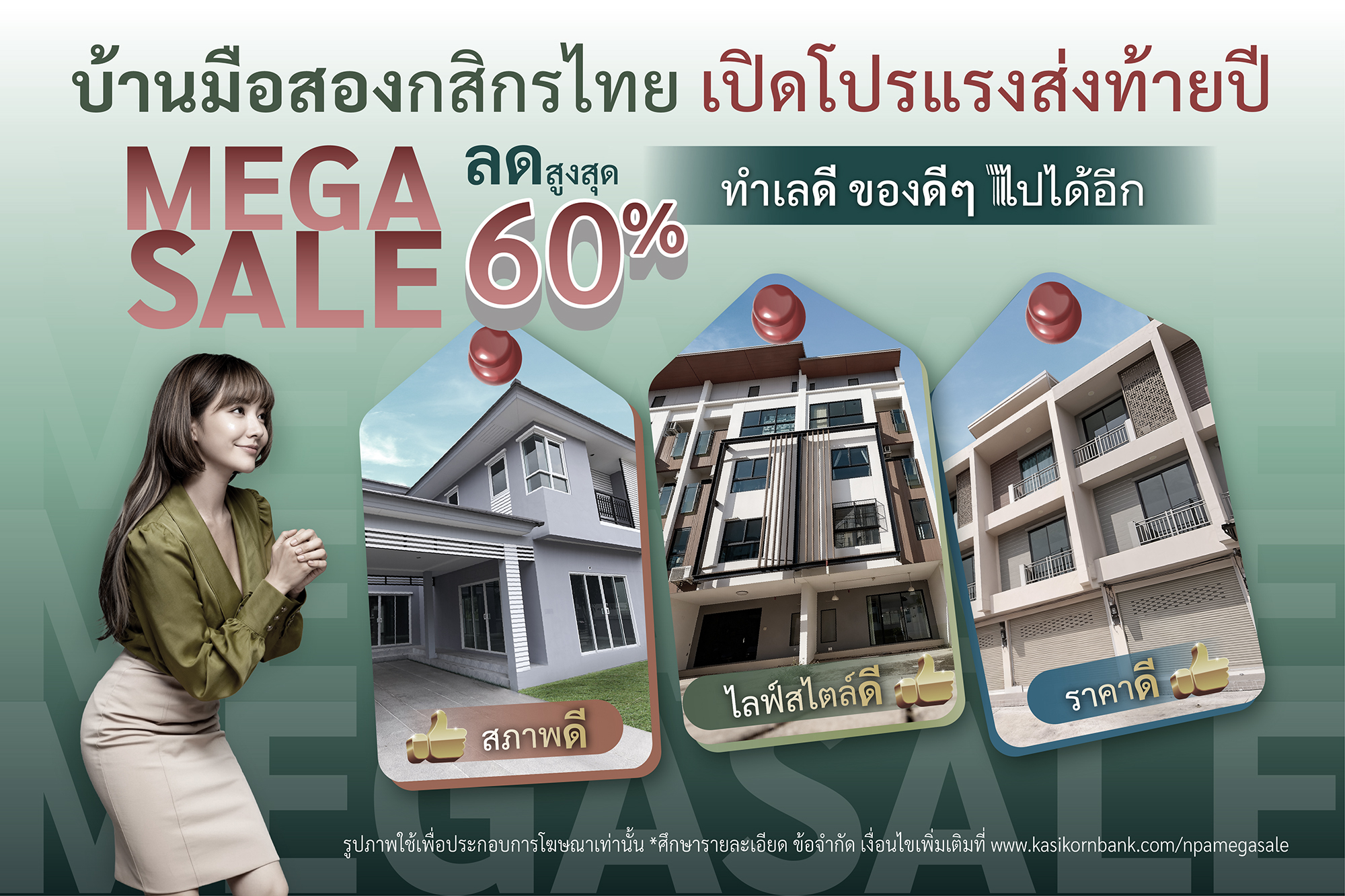 กสิกรไทยจัดโปรแรง บ้านมือสองส่งท้ายปี Mega Sale ลดสูงสุด 60% ราคาดี ทำเลดี สภาพดี ของดีๆ ไปได้อีก
