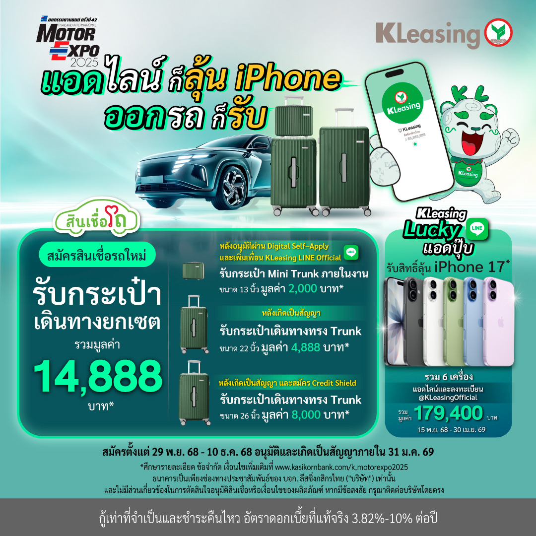 ลีสซิ่งกสิกรไทยมอบข้อเสนอสุดพิเศษส่งท้ายปีในงานมหกรรมยานยนต์ Motor Expo 2025 ครั้งที่ 42 ให้ลูกค้าที่ แอดไลน์ @kleasingofficial ลุ้นรับไอโฟน 17 จำนวน 6 เครื่อง และลูกค้าที่สมัครสินเชื่อรถยนต์ใหม่ในงานรับกระเป๋าเดินทางยกเซต พร้อมชูความเป็นผู้นำด้านการให้สินเชื่ออย่างรับผิดชอบและเป็นธรรม (Responsible Lending) ด้วย “K OK” แพลตฟอร์มสมัครสินเชื่อรถยนต์ด้วยตนเอง ที่ช่วยให้ลูกค้าทราบผลวงเงินอนุมัติจริงก่อนออกรถ ตั้งเป้าปริมาณยอดธุรกิจผ่านช่องทางดิจิทัลสูงกว่า 50%