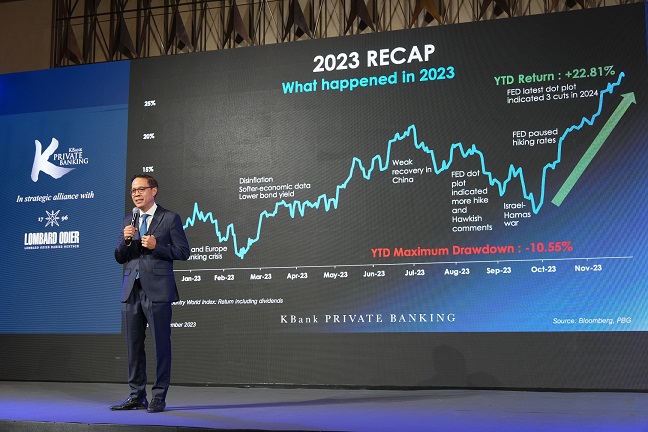 นายจิรวัฒน์ สุภรณ์ไพบูลย์ Executive Chairman, Private Banking Group ธนาคารกสิกรไทย เปิดเผยว่า ในปีที่ผ่านมา ตลาดลงทุนเผชิญกับหลายเหตุการณ์ที่สร้างความผันผวน เริ่มตั้งแต่ปลายไตรมาสแรกที่เสถียรภาพการเงินโลกสั่นคลอน จากการปิดตัวลงของ Silicon Valley Bank (SVB) และวิกฤต Credit Suisse (CS) ในขณะที่ไตรมาส 2 ตลาดปรับตัวขึ้นได้ จากอัตราเงินเฟ้อในสหรัฐฯ ที่เข้าใกล้จุดสูงสุด อย่างไรก็ตามในช่วงไตรมาส 3 เศรษฐกิจจีนไม่สามารถฟื้นตัวได้ตามที่ตลาดคาดหวัง ทำให้ภาพรวมตลาดอ่อนแอลงอีกครั้ง ประกอบกับความไม่แน่นอนของ FED หรือธนาคารกลางสหรัฐฯ ที่ยังไม่ชัดเจนเรื่องอัตราดอกเบี้ยว่าจะหยุดขึ้นหรือจะขึ้นต่อ ตามมาติดๆ ด้วยความขัดแย้งระหว่างอิสราเอลและกลุ่มฮามาสที่เริ่มต้นขึ้นในช่วงต้นเดือนตุลาคม ทำให้ตลาดการลงทุนปรับตัวลงต่อเนื่อง อย่างไรก็ดี ตลาดมีแนวโน้มดีขึ้น ในช่วงเดือนพฤศจิกายนและธันวาคม จากการหยุดขึ้นดอกเบี้ยของ FED และส่งสัญญาณว่าจะลดดอกเบี้ยในปี 2567 ทำให้ผลตอบแทนสำหรับปี 2566 ของตลาดหุ้นโลกปรับตัวสูงขึ้นประมาณ 23%