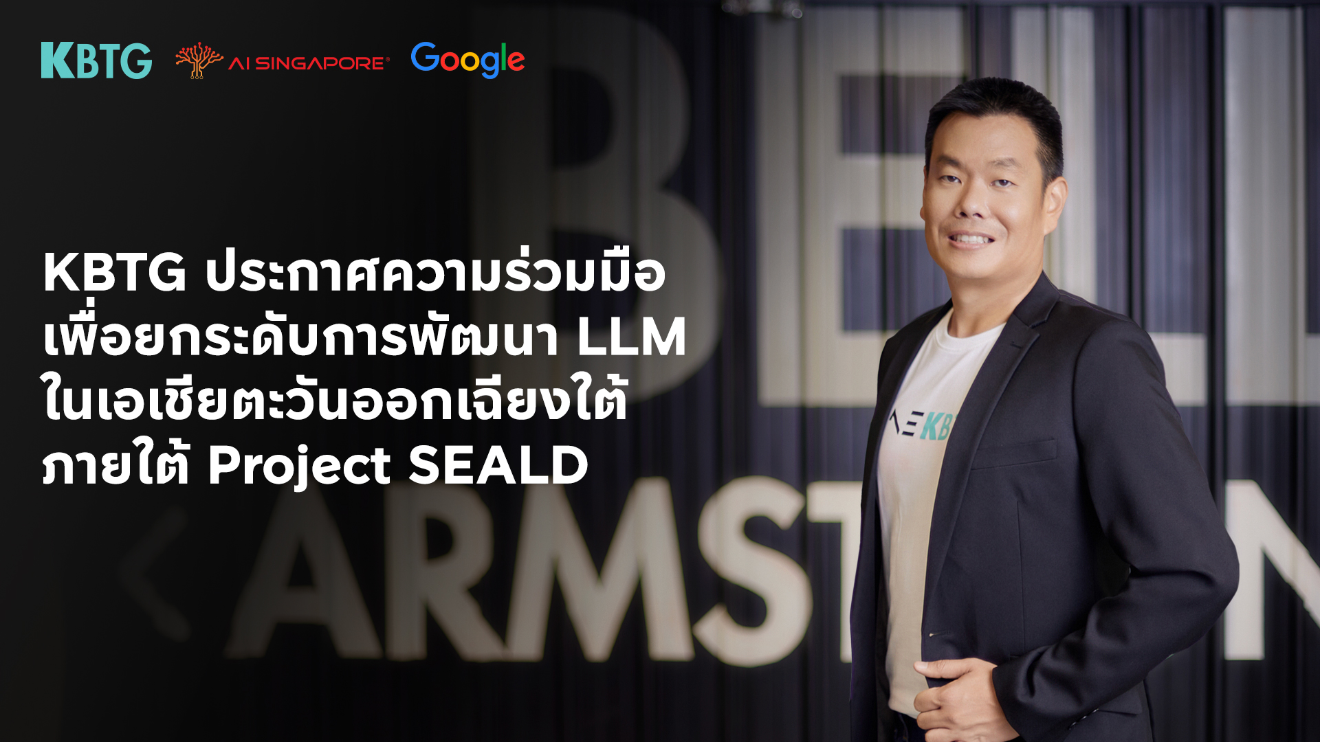 KBTG ประกาศความร่วมมือกับพาร์ทเนอร์ระดับโลกอย่าง AI Singapore และ Google Research เพื่อขับเคลื่อนการพัฒนา LLM ในภูมิภาค ตอกย้ำยุทธศาสตร์ Human First x AI First ของ KBTG และบทบาทผู้นำด้าน AI ในเอเชียตะวันออกเฉียงใต้ของบริษัท ในการวิจัย พัฒนา และศึกษาเทคโนโลยีระดับโลก ภายใต้โครงการซีลด์ (Project SEALD) เร่งเสริมแกร่งเทคโนโลยีทางการเงินและสร้างสรรค์ผลผลิตด้านไอทีที่เป็นประโยชน์ให้กับลูกค้าทั่วทั้งภูมิภาคและธนาคารกสิกรไทยอย่างมีประสิทธิภาพและยั่งยืน