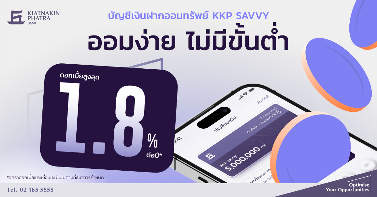 นายฟิลิป เชียง ชอง แทน กรรมการผู้จัดการใหญ่ ธนาคารเกียรตินาคินภัทร จำกัด (มหาชน) กล่าวว่า “ธนาคารเพิ่มทางเลือกในการออมเงินที่ได้รับผลตอบแทนสูง โดยปรับขึ้นอัตราดอกเบี้ย KKP SAVVY บัญชีเงินฝากออมทรัพย์ออนไลน์ที่เปิดง่ายผ่านแอปพลิเคชัน KKP MOBILE สูงสุดเป็น 1.8% ต่อปี (จากเดิม 1.6% ต่อปี*) เพื่อสร้างแรงจูงใจให้กับลูกค้าในการเก็บออม ตลอดจนเป็นการขยายฐานลูกค้าเงินฝาก รับกระแสช่วงที่อัตราดอกเบี้ยนโยบายยังอยู่ในระดับสูง โดยธนาคารตั้งเป้ายอดเงินฝากไว้ที่ 30,000 ล้านบาท”