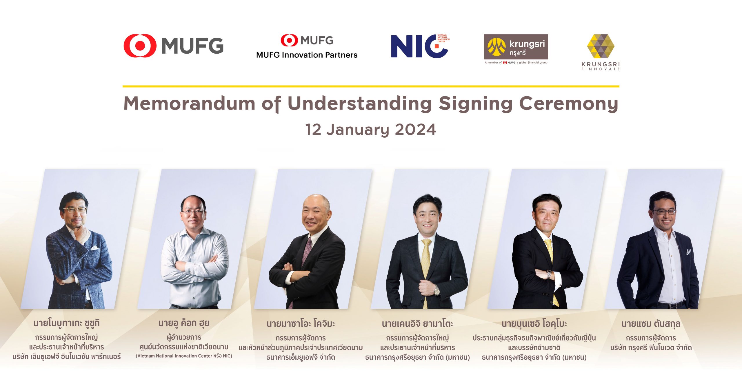 การลงนามในข้อตกลงความร่วมมือดังกล่าวจัดขึ้นในรูปแบบออนไลน์ เมื่อเร็วๆ นี้ โดยมี นายเคนอิจิ ยามาโตะ กรรมการผู้จัดการใหญ่และประธานเจ้าหน้าที่บริหาร ธนาคารกรุงศรีอยุธยา จำกัด (มหาชน) นายบุนเซอิ โอคุโบะ ประธานกลุ่มธุรกิจธนกิจพาณิชย์เกี่ยวกับญี่ปุ่นและบรรษัทข้ามชาติ ธนาคารกรุงศรีอยุธยา จำกัด (มหาชน) นายอู ค็อก ฮุย ผู้อำนวยการศูนย์นวัตกรรมแห่งชาติเวียดนาม (NIC) นายมาซาโอะ โคจิมะ กรรมการผู้จัดการและหัวหน้าส่วนภูมิภาคประจำประเทศเวียดนาม ธนาคารเอ็มยูเอฟจี จำกัด (MUFG Bank) นายโนบูทาเกะ ซูซูกิ กรรมการผู้จัดการใหญ่และประธานเจ้าหน้าที่บริหาร เอ็มยูเอฟจี อินโนเวชัน พาร์ทเนอร์ (MUIP) และนายแซม ตันสกุล กรรมการผู้จัดการ บริษัท กรุงศรี ฟินโนเวต จำกัด ร่วมลงนาม โดยมีระยะเวลาของแผนการดำเนินงานใน 5 ปี ที่ให้ความสำคัญกับการสนับสนุนกิจกรรม 4 ด้าน ได้แก่ การส่งเสริมและสนับสนุนการเติบโตของสตาร์ทอัพเวียดนามในระดับสากลผ่านเครือข่ายที่แข็งแกร่งของกรุงศรีและ MUFG