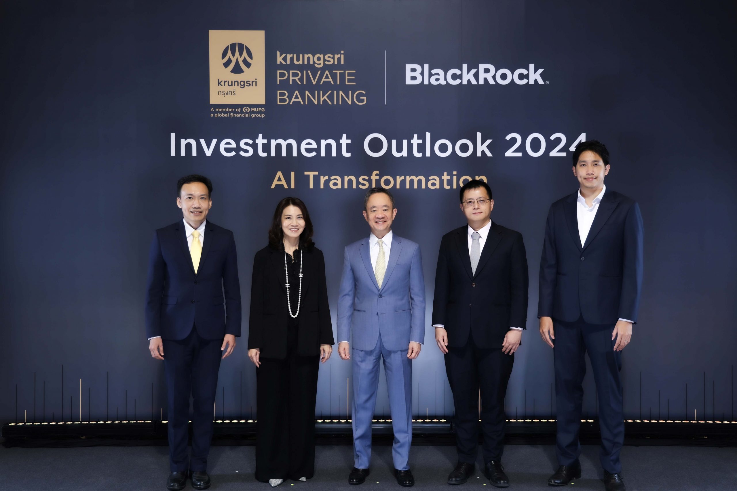 กรุงศรี ไพรเวท แบงก์กิ้ง นำโดย นายพงษ์อนันต์ ธณัติไตร (กลาง) ประธานกลุ่มธุรกิจลูกค้ารายย่อยและลูกค้าบุคคล ธนาคารกรุงศรีอยุธยา จำกัด (มหาชน) และนางสาวกนกวรรณ ศุภนันตฤกษ์ (ที่ 2 จากซ้าย) ประธานคณะเจ้าหน้าที่ด้านเครือข่ายการขาย จับมือ แบล็คร็อค บริษัทหลักทรัพย์จัดการกองทุนชั้นนำของโลก พันธมิตรด้านการบริหารจัดการความมั่งคั่งของกรุงศรี จัดสัมมนาพิเศษ Investment Outlook 2024 & AI Transformation สำหรับลูกค้ากรุงศรี ไพรเวทแบงก์กิ้งโดยเฉพาะ โดยได้รับเกียรติจาก Mr. Ben Bei (ที่ 2 จากขวา) Director of BlackRock ดร.ณภัทร จาตุศรีพิทักษ์ (ขวา) ผู้ก่อตั้งและซีอีโอ ViaLink และนายวิน พรหมแพทย์ CFA (ซ้าย) ผู้ช่วยกรรมการผู้จัดการใหญ่ ผู้บริหารสายงานลูกค้าไฮเน็ตเวิร์ธ ร่วมเผยมุมมองเศรษฐกิจและการลงทุน พร้อมเจาะลึกเทรนด์ AI ในปี 2024 งานสัมมนาดังกล่าวจัดขึ้นเมื่อเร็วๆ นี้ ณ โรงแรม พาร์ค ไฮแอท กรุงเทพฯ