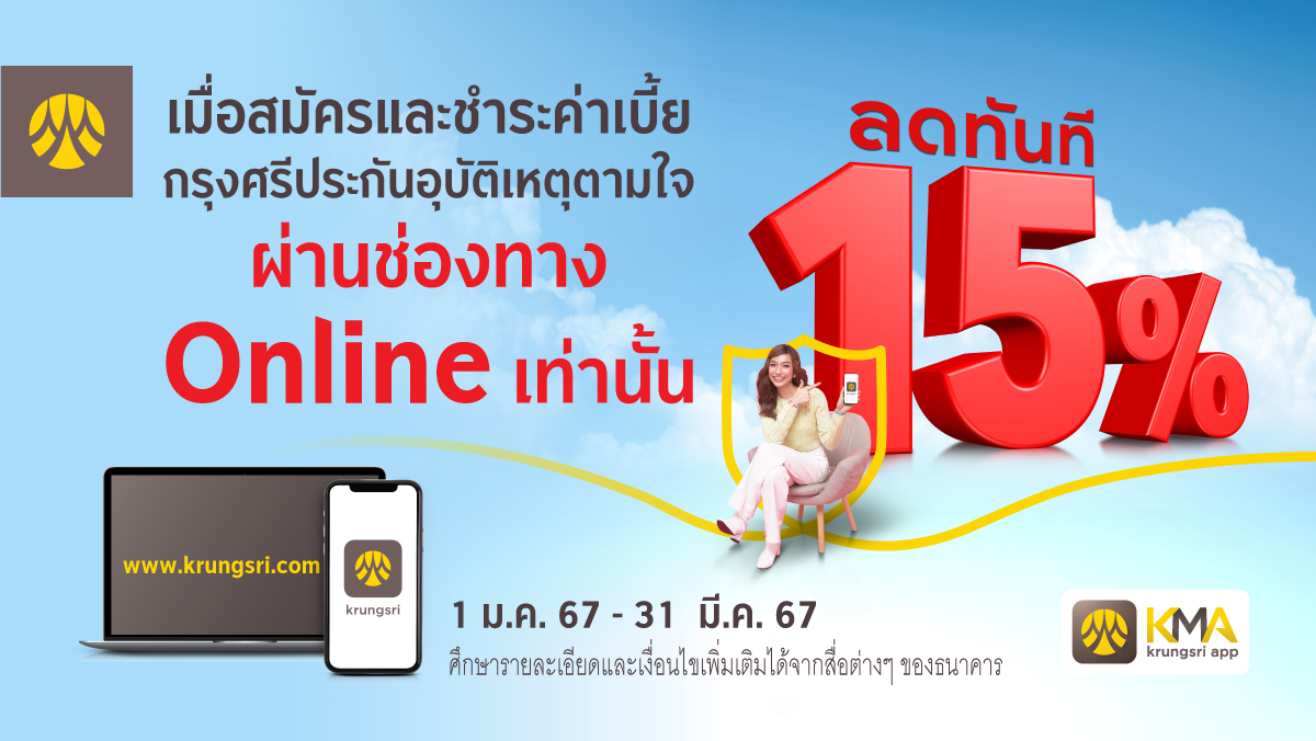 “ซื้อกรุงศรีประกันอุบัติเหตุตามใจ” ผ่านช่องทางออนไลน์ รับส่วนลด 15% ทันที