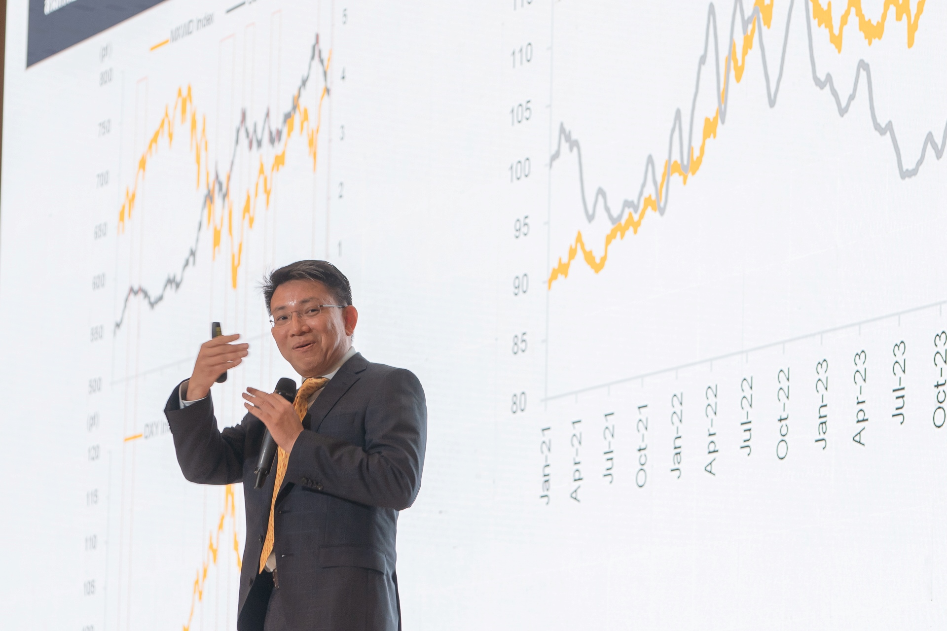 ด้านนายอิสระ อรดีดลเชษฐ์ ผู้ช่วยกรรมการผู้จัดการใหญ่กลุ่มงานวิเคราะห์หลักทรัพย์ บริษัท หลักทรัพย์ กรุงศรี จำกัด (มหาชน) ได้ให้มุมมองภาพรวมเกี่ยวกับตลาดหุ้นต่างประเทศ และหุ้นไทยในปีนี้ว่า ช่วงไตรมาส 4/2567 ภาพรวมตลาดหุ้นโต 1.6% แต่หากเอาหุ้นเทคที่กล่าวถึง 6-7 ตัวออก Earning Growth จะยังคงติดลบอยู่ประมาณ 10% ดังนั้นจะต้องเพิ่มความระมัดระวัง โดยอาจจะเพิ่มหุ้น Defensive เช่น หุ้นกลุ่มโรงพยาบาล กลุ่มสินค้าอุปโภคบริโภค รวมไปถึงหุ้นกลุ่ม Generative AI ซึ่งหากใครยังไม่มีอาจจะต้องรอจังหวะค่อยๆ สะสมไป รวมไปถึงพันธบัตรรัฐบาลที่น่าสนใจด้วย Yield ที่สูงประมาณ 4% กว่า ถือไว้ยังไงก็ไม่ขาดทุน ในส่วนของตลาดหุ้นไทยค่อนข้าง Laggard และตอนนี้เข้าข่าย Low Growth, Low Inflation ซึ่งน่าจะปิดปีที่ประมาณ 1,450 แต่ถ้า FED ลดดอกเบี้ยได้เร็ว และตลาดเริ่มฟื้นอาจจะปิดที่ประมาณ 1,500 แนะนำควรจะหลีกเลี่ยงหุ้นใหญ่ และรอดูสัญญาณ Macro ก่อน เน้นหุ้นที่มีธีมชัดๆ และมี Earning Growth ที่ชัดเจน เช่น หุ้นกลุ่ม ICT ได้แก่ TRUE หรือ ADVANC รวมไปถึงกลุ่มสินค้าแฟชันอย่าง MC และ Sabina ซึ่งเป็นหุ้นตัวเล็กทั้งคู่ แต่ Perform ค่อนข้างดี นอกจากนี้ ยังคงแนะนำหุ้นกลุ่มโรงพยาบาลที่สามารถถือได้ยาวๆ โดยมองเป้า SET Index ไว้ใน 3 กรณี คือ 1) หากมีการกระตุ้นเศรษฐกิจ ที่ 1,717 2) หากไม่มีการกระตุ้นเศรษฐกิจ ที่ 1,644 และ 3) หากเศรษฐกิจเติบโตชะลอ และเงินเฟ้อต่ำ ที่ 1,465