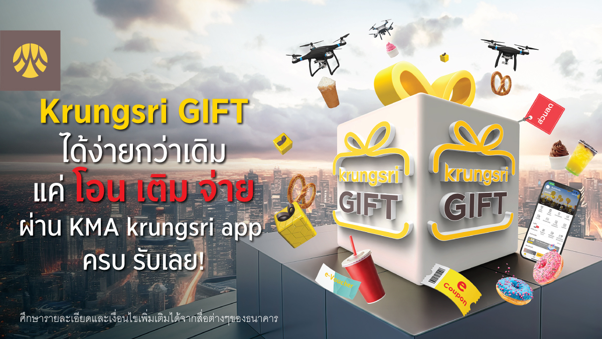 ธนาคารกรุงศรีอยุธยา จำกัด (มหาชน) มอบสิทธิพิเศษให้คุณรับกิฟท์ เพื่อใช้กิฟต์แลกรับส่วนลดร้านค้าดัง ของกิน และเครื่องดื่มอร่อยๆ ตลอดทั้งปี ได้ง่ายๆ เพียงทำธุรกรรม โอนเงิน เติมเงิน และจ่ายเงิน ผ่านช่องทาง KMA krungsri app ให้ครบ 3 ประเภท ในแต่ละเดือน โดยมียอดขั้นต่ำ 100 บาทต่อธุรกรรม เมื่อปฏิบัติครบตามเงื่อนไขในแต่ละเดือนระหว่างวันที่ 1 มกราคม – 31 ธันวาคม 2567 จะได้รับกิฟท์ จำนวน 1 กิฟท์ ภายใน 7 วันทำการ ผ่านทาง KMA krungsri app นับจากวันที่ทำภารกิจสำเร็จ ทั้งนี้ ลูกค้าสามารถเลือกทำธุรกรรมเพื่อร่วมภารกิจได้ 2 ทางเลือก ผ่านช่องทาง KMA krungsri app ได้แก่ ทำรายการผ่านเมนูโอนเงิน เติมเงิน และจ่ายบิล หรือ ทำรายการผ่านเมนูสแกนจ่าย