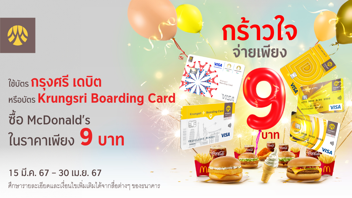 กรุงศรี (ธนาคารกรุงศรีอยุธยา จำกัด (มหาชน)) มอบสิทธิพิเศษแก่ลูกค้าธนาคาร เพียงใช้บัตรกรุงศรี เดบิต หรือบัตร Krungsri Boarding Card ซื้อ McDonald’s เมนู ชุดสุดคุ้ม สุขทุกวัน และ ไอศกรีมโคน ในราคากร้าวใจ จ่ายเพียง 9 บาท จากปกติมูลค่าสูงสุด 234 บาท (เฉพาะสาขาที่ร่วมรายการ) ตั้งแต่วันที่ 15 มีนาคม 2567–30 เมษายน 2567