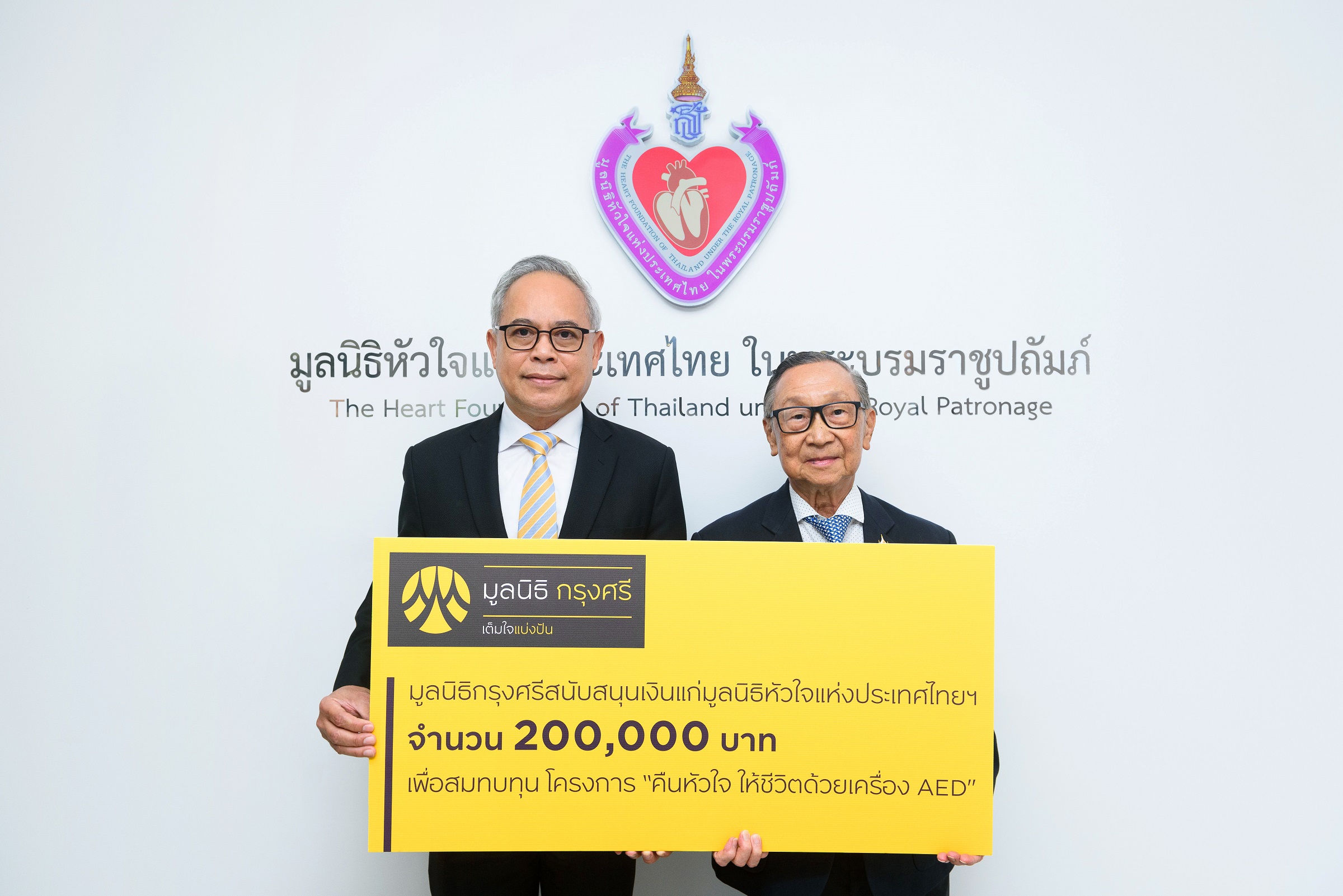 นายไพโรจน์ ชื่นครุฑ (ซ้าย) ประธานคณะเจ้าหน้าที่ด้านกลยุทธ์และวางแผนธุรกิจองค์กร ธนาคารกรุงศรีอยุธยา จำกัด (มหาชน) ในฐานะผู้แทนมูลนิธิกรุงศรี มอบเงินสนับสนุนแก่มูลนิธิหัวใจแห่งประเทศไทย ในพระบรมราชูปถัมภ์ จำนวน 200,000 บาท เพื่อจัดซื้อเครื่องกระตุกหัวใจไฟฟ้าอัตโนมัติ (AED) ภายใต้โครงการ “คืนหัวใจให้ชีวิตด้วยเครื่อง AED” ซึ่งเป็นการช่วยเหลือผู้ป่วยโรคหัวใจอย่างต่อเนื่องเป็นปีที่ 3 โดยมี ศาสตราจารย์เกียรติคุณนายแพทย์ศุภชัย ไชยธีระพันธ์ (ขวา) รองประธานกรรมการ มูลนิธิหัวใจแห่งประเทศไทยฯ เป็นผู้แทนรับมอบ