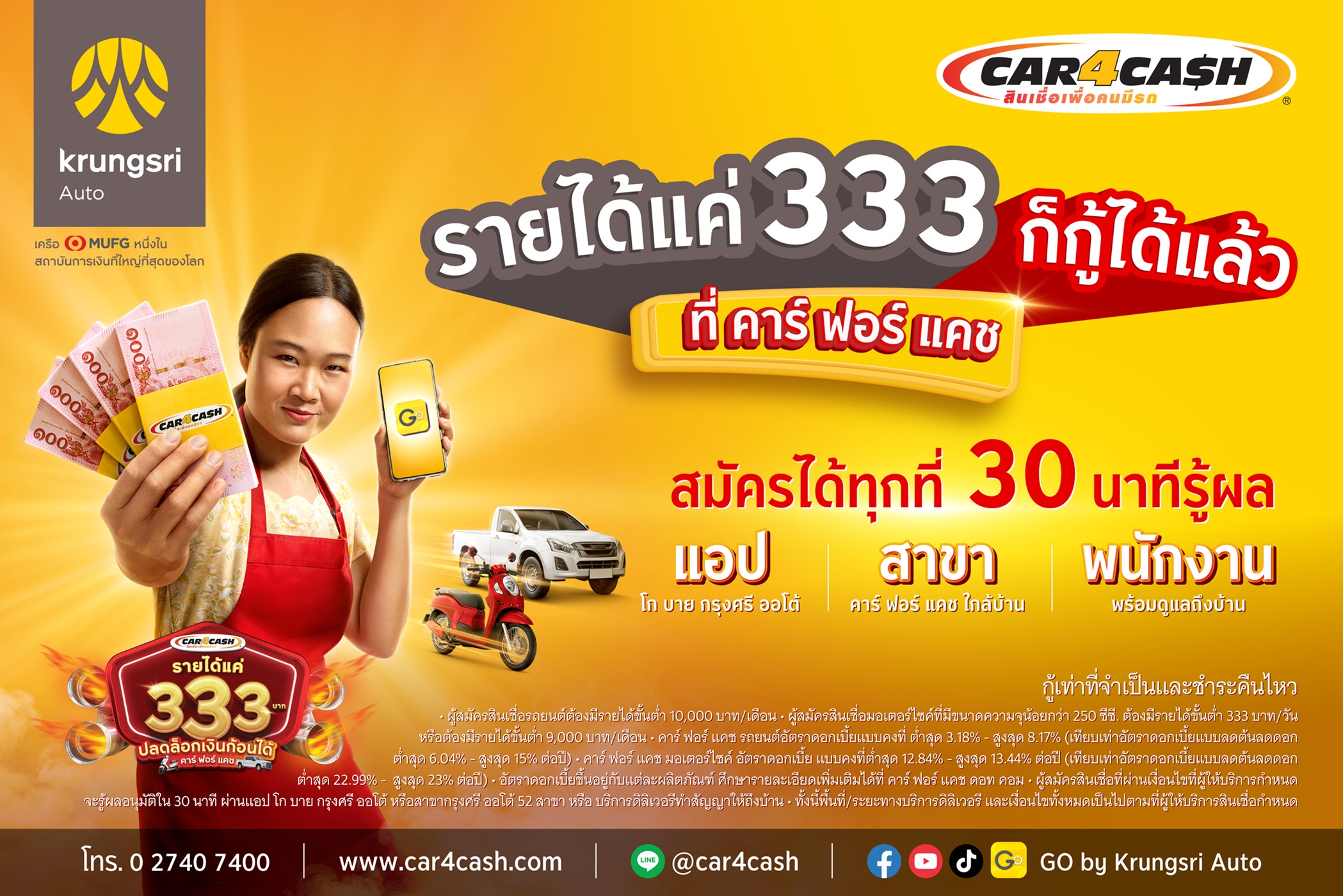 ‘คาร์ ฟอร์ แคช’ ตอบโจทย์กลุ่มเจ้าของรถยนต์และมอเตอร์ไซค์ ที่เป็นพนักงานรายวันหรือประกอบอาชีพอิสระ กับสินเชื่อเพื่อคนมีรถ เพื่อเสริมสภาพคล่อง จัดการรายจ่ายที่ไม่คาดคิด พร้อมรู้ผลอนุมัติไวภายใน 30 นาที ที่แอป โก บาย กรุงศรี ออโต้ (GO by Krungsri Auto Application) โดยยังมีรถไว้ใช้ในชีวิตประจำวันต่อยอดอาชีพได้เหมือนเดิม ด้วยข้อเสนอสำหรับเจ้าของมอเตอร์ไซค์ รายได้เริ่มต้นที่ 333 บาท/วัน และมีรายได้สม่ำเสมอเริ่มต้นที่ 9,000 บาท/เดือน* เจ้าของรถยนต์รายได้เริ่มต้นที่ 334 บาท/วัน หรือรายได้สม่ำเสมอเริ่มต้นที่ 10,000 บาท/เดือน ตามแนวทางการให้สินเชื่ออย่างรับผิดชอบและเป็นธรรม